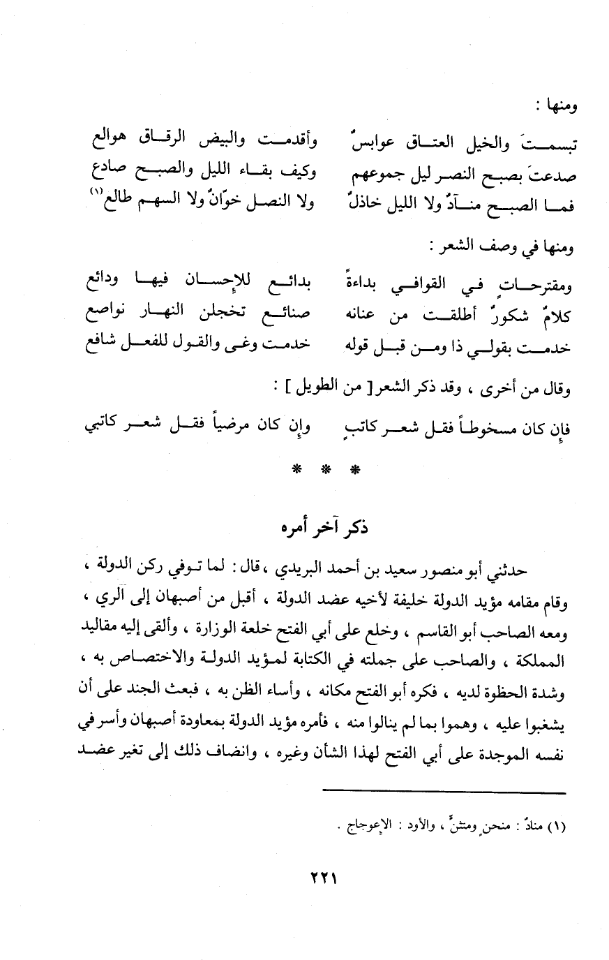 حَدثنِي أَبُو مَنْصُور سعيد بن أَحْمد البريدي قَالَ لما توفّي ركن الدولة وَقَامَ مقَامه مؤيد الدولة خَليفَة لِأَخِيهِ عضد الدولة أقبل من أَصْبَهَان إِلَى الرّيّ وَمَعَهُ الصاحب أَبُو الْقَاسِم وخلع على أبي الْفَتْح خلعة الوزارة وَألقى إِلَيْهِ مقاليد المملكة والصاحب على جملَته فِي الْكِتَابَة لمؤيد الدولة والإختصاص بِهِ وَشدَّة الحظوة لَدَيْهِ فكره أَبُو الْفَتْح مَكَانَهُ وأساء الظَّن بِهِ فَبعث الْجند على أَن يشغبوا عَلَيْهِ وهموا بِمَا لم ينالوا مِنْهُ فَأمره مؤيد الدولة بمعاودة أَصْبَهَان وَأسر فِي نَفسه الموجدة على أبي الْفَتْح لهَذَا الشَّأْن وَغَيره وانضاف ذَلِك إِلَى تغير عضد