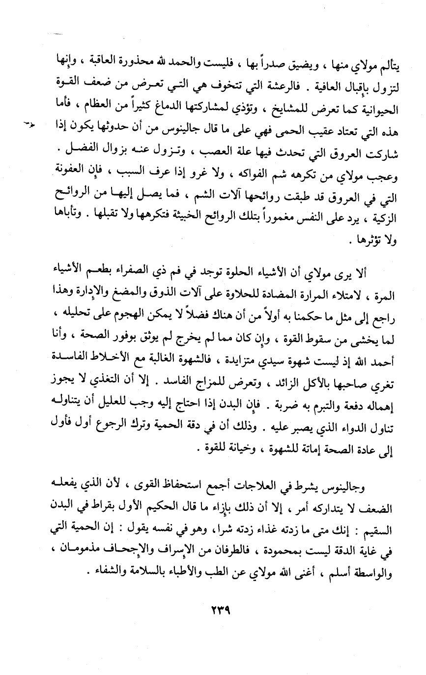 أَلا يرى مولَايَ أَن الْأَشْيَاء الحلوة تُوجد فِي فَم ذِي الصَّفْرَاء بطعم الْأَشْيَاء الْمرة لإمتلاء المرارة المضادة للحلاوة على آلَات الذَّوْق والمضغ والإدارة وَهَذَا رَاجع إِلَى مثل مَا حكمنَا بِهِ أَولا من أَن هُنَاكَ فضلا لَا يُمكن الهجوم على تَحْلِيله لما يخْشَى من سُقُوط الْقُوَّة وَإِن كَانَ مِمَّا لم يخرج لم يوثق بوفور الصِّحَّة وَأَنا أَحْمد الله إِذْ لَيست شَهْوَة سَيِّدي متزايدة فالشهوة الْغَالِبَة مَعَ الأخلاط الْفَاسِدَة تغري صَاحبهَا الْأكل الزَّائِد وَتعرض للمزاج الْفَاسِد إِلَّا أَن التغذي لَا يجوز إهماله دفْعَة والتبرم بِهِ ضَرْبَة