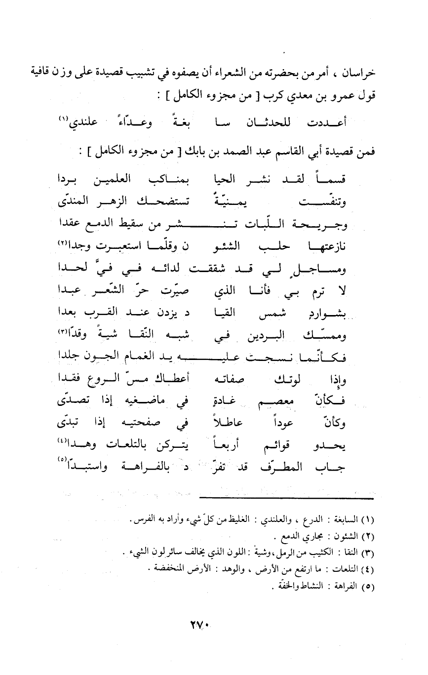خُرَاسَان أَمر من بِحَضْرَتِهِ من الشُّعَرَاء أَن يصفوه فِي تشبيب قصيدة على وزن قافية قَول عَمْرو بن معدي كرب