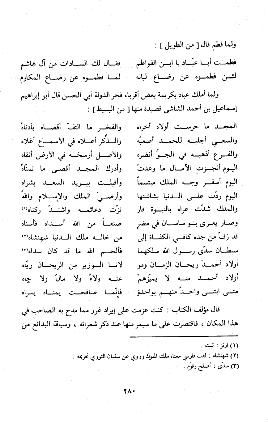 وَلما أملك عباد بكريمة بعض أقرباء فَخر الدولة أبي الْحسن قَالَ أَبُو إِبْرَاهِيم إِسْمَاعِيل بن أَحْمد الشَّاشِي قصيدة مِنْهَا