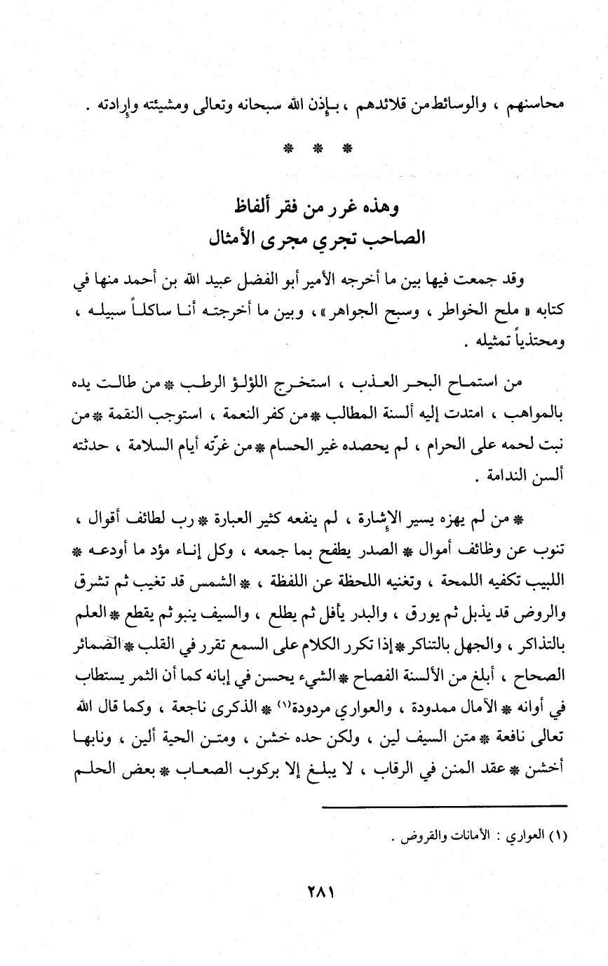 من استماح الْبَحْر العذب استخرج اللُّؤْلُؤ الرطب من طَالَتْ يَده بالمواهب امتدت إِلَيْهِ أَلْسِنَة المطالب من كفر النِّعْمَة اسْتوْجبَ النقمَة من نبت لَحْمه على الْحَرَام لم يحصده غير الحسام من غرته أَيَّام السَّلَام حدثته ألسن الندامة