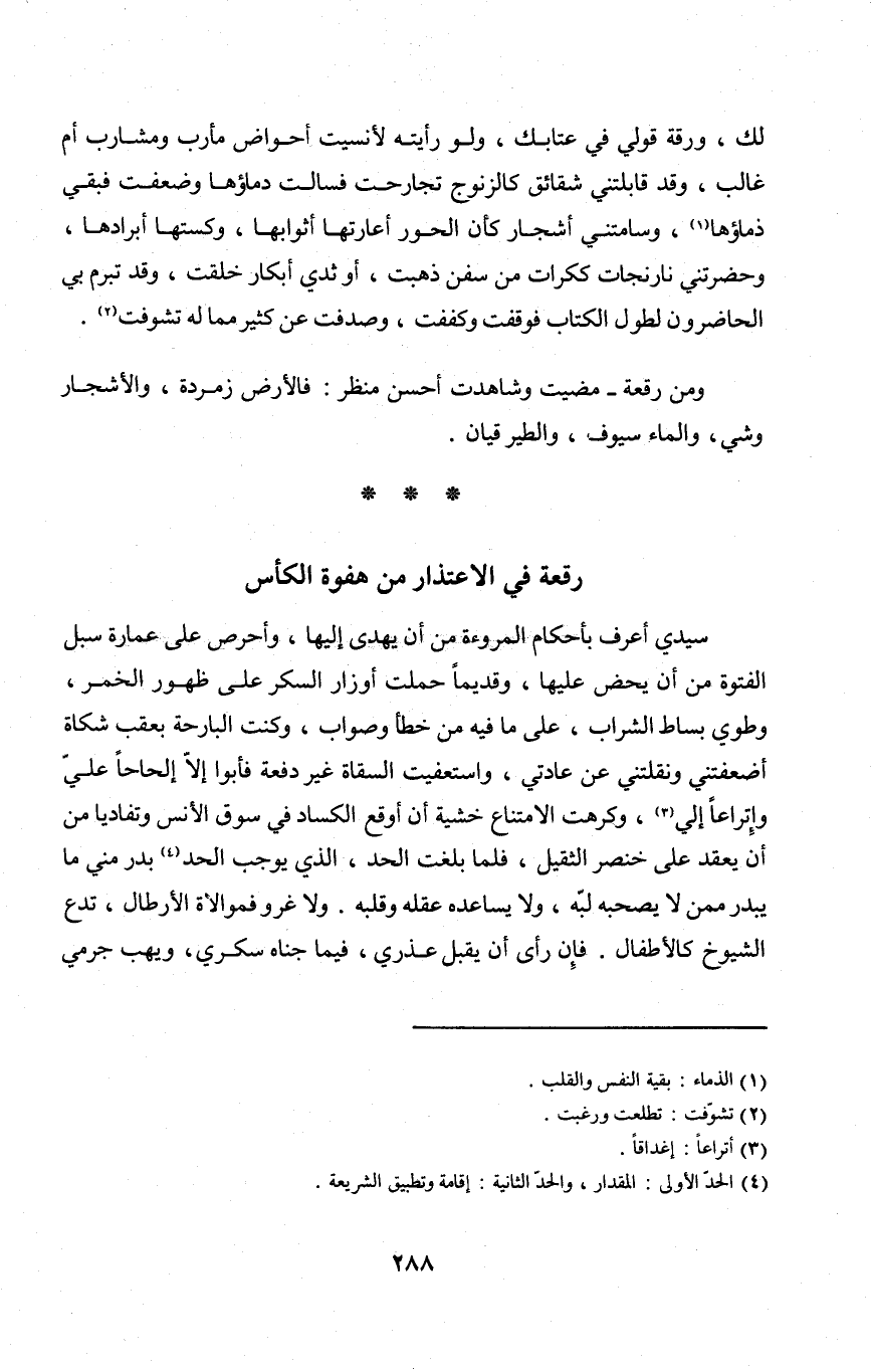 سَيِّدي أعرف بِأَحْكَام الْمُرُوءَة من أَن يهدى إِلَيْهَا وأحرص على عمَارَة سبل الفتوة من أَن يحض عَلَيْهَا وقديما حملت أوزار السكر على ظُهُور الْخمر وطوي بِسَاط الشَّرَاب على مَا فِيهِ من خطأ وصواب وَكنت البارحة بعقب شكاة أضعفتني ونقلتني عَن عادتي واستعفيت السقاة غير دفْعَة فابوا إِلَّا إلحاحا عَليّ وإتراعا إِلَيّ وكرهت الإمتناع خشيَة أَن أوقع الكساد فِي سوق الْأنس وتفاديا من أَن يقْعد على خنصر الثقيل فَلَمَّا بلغت الْحَد الَّذِي يُوجب الْحَد بدر مني مَا يبدر مِمَّن لَا يَصْحَبهُ لبه وَلَا يساعده عقله وَقَلبه