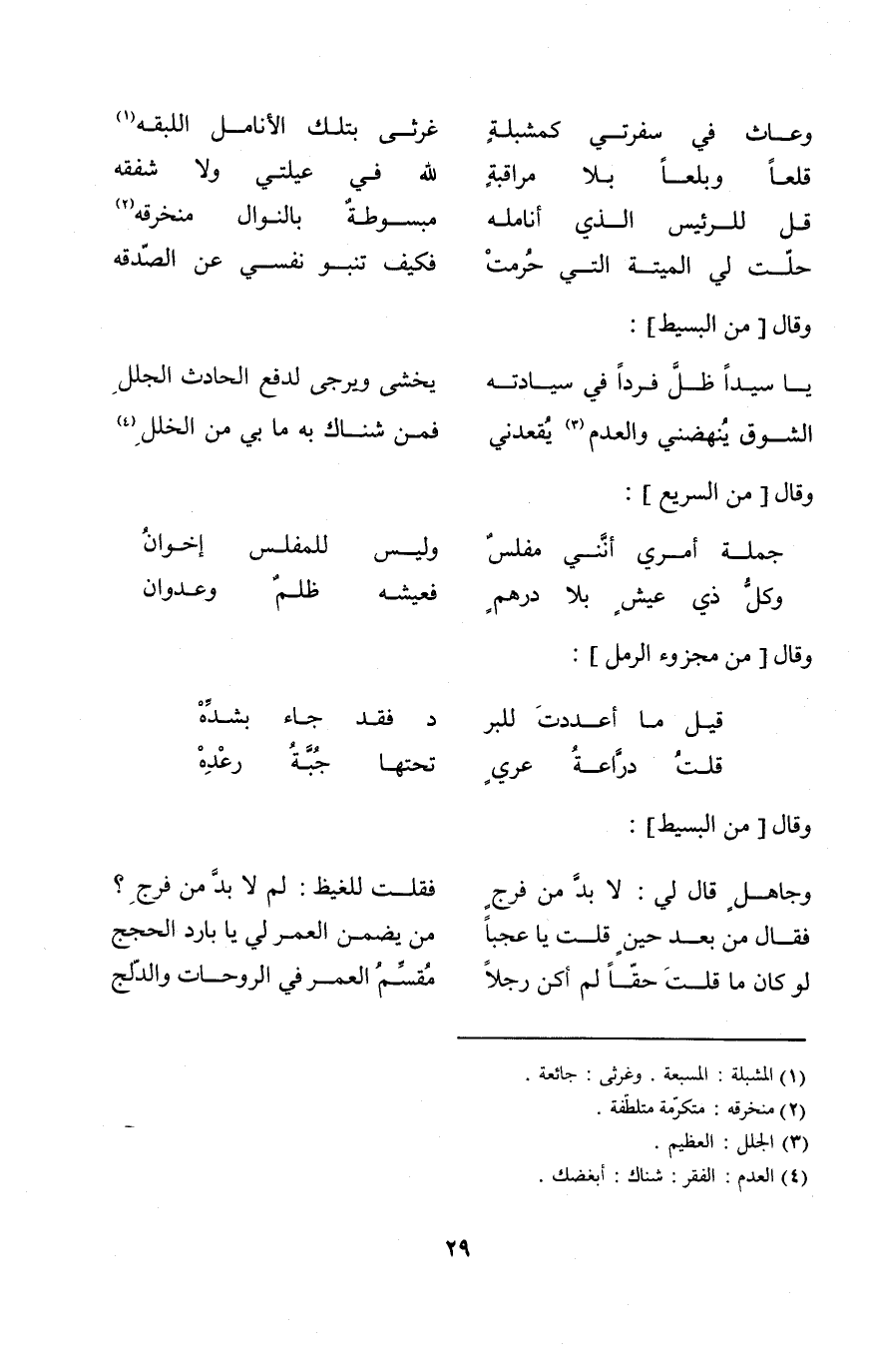 (جملَة أَمْرِي أنني مُفلس ... وَلَيْسَ للْمُفلس إخْوَان)