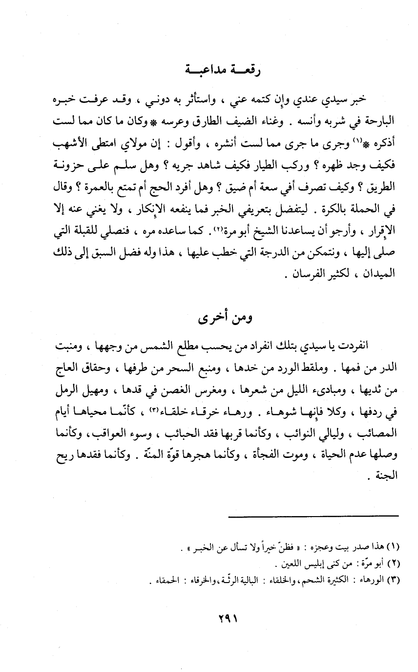 وغناء الضَّيْف الطارق وعرسه وَكَانَ مَا كَانَ مِمَّا لست أذكرهُ وَجرى مَا جرى مِمَّا لست أنشره وَأَقُول إِن مولَايَ امتطى الْأَشْهب فَكيف وجد ظَهره وَركب الطيار فَكيف شَاهد جريه وَهل سلم على حزونة الطَّرِيق وَكَيف تصرف أَفِي سَعَة أم ضيق وَهل أفرد الْحَج أم تمتّع بِالْعُمْرَةِ وَقَالَ فِي الحملة بالكرة