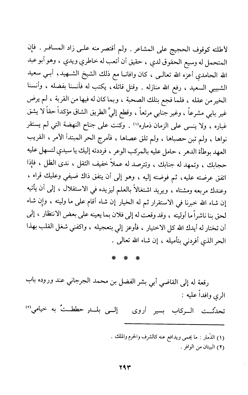 رقْعَة لَهُ إِلَى القَاضِي أبي بشر الْفضل بن مُحَمَّد الْجِرْجَانِيّ عِنْد وُرُوده بَاب الرّيّ وافدا عَلَيْهِ