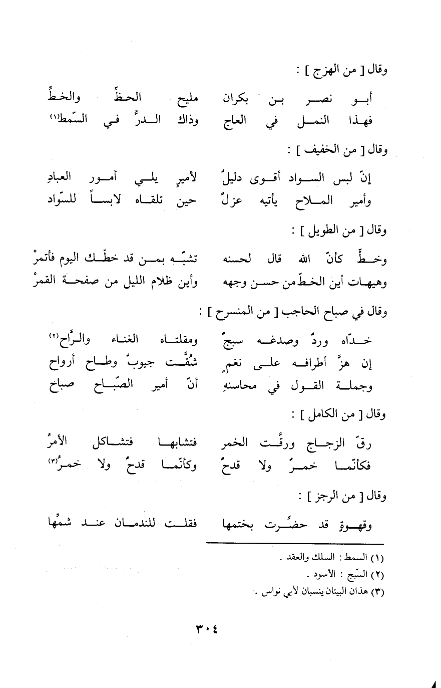 (فَهَذَا النَّمْل فِي العاج ... وَذَاكَ الدّرّ فِي السمط) // الهزج //