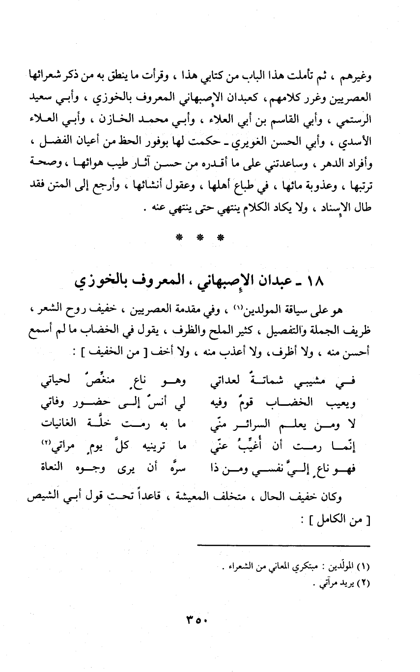 وَغَيرهم ثمَّ تَأَمَّلت هَذَا الْبَاب من كتابي هَذَا وقرأت مَا ينْطق بِهِ من ذكر شعرائها العصريين وغرر كَلَامهم كعبدان الإصبهاني الْمَعْرُوف بالخوزي وَأبي سعيد الرستمي وَأبي الْقَاسِم بن أبي الْعَلَاء وَأبي مُحَمَّد الخازن وَأبي الْعَلَاء الْأَسدي وَأبي الْحسن الغويري حكمت لَهَا بوفور الْحَظ من أَعْيَان الْفضل وأفراد الدَّهْر وساعدتني على مَا أقدره من حسن آثَار طيب هوائها وَصِحَّة ترتبها وعذوبة مَائِهَا فِي طباع أَهلهَا وعقول أنشائها وأرجع إِلَى الْمَتْن فقد طَال الْإِسْنَاد وَلَا يكَاد الْكَلَام يَنْتَهِي حَتَّى يَنْتَهِي عَنهُ
