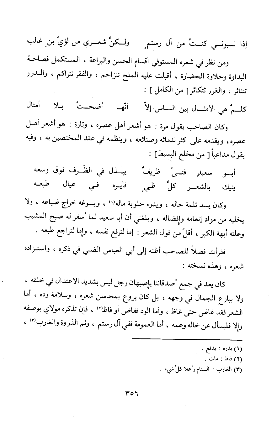 فَقَرَأت فصلا للصاحب أَظُنهُ إِلَى أبي الْعَبَّاس الضَّبِّيّ فِي ذكره واستزادة شعره وَهَذِه نسخته كَانَ يعد فِي جمع أصدقائنا بإصبهان رجل لَيْسَ بشديد الإعتدال فِي خلقه وَلَا ببارع الْجمال فِي وَجهه بل كَانَ يروع بمحاسن شعره وسلامة وده أما الشّعْر فقد غاض حَتَّى غاظ وَأما الود فَفَاضَ أَو فاظ فَإِن تذكره مولَايَ بوصفه وَإِلَّا فليسأل عَن خَاله وَعَمه أما العمومة فَفِي آل رستم وَثمّ الذرْوَة وَالْغَارِب
