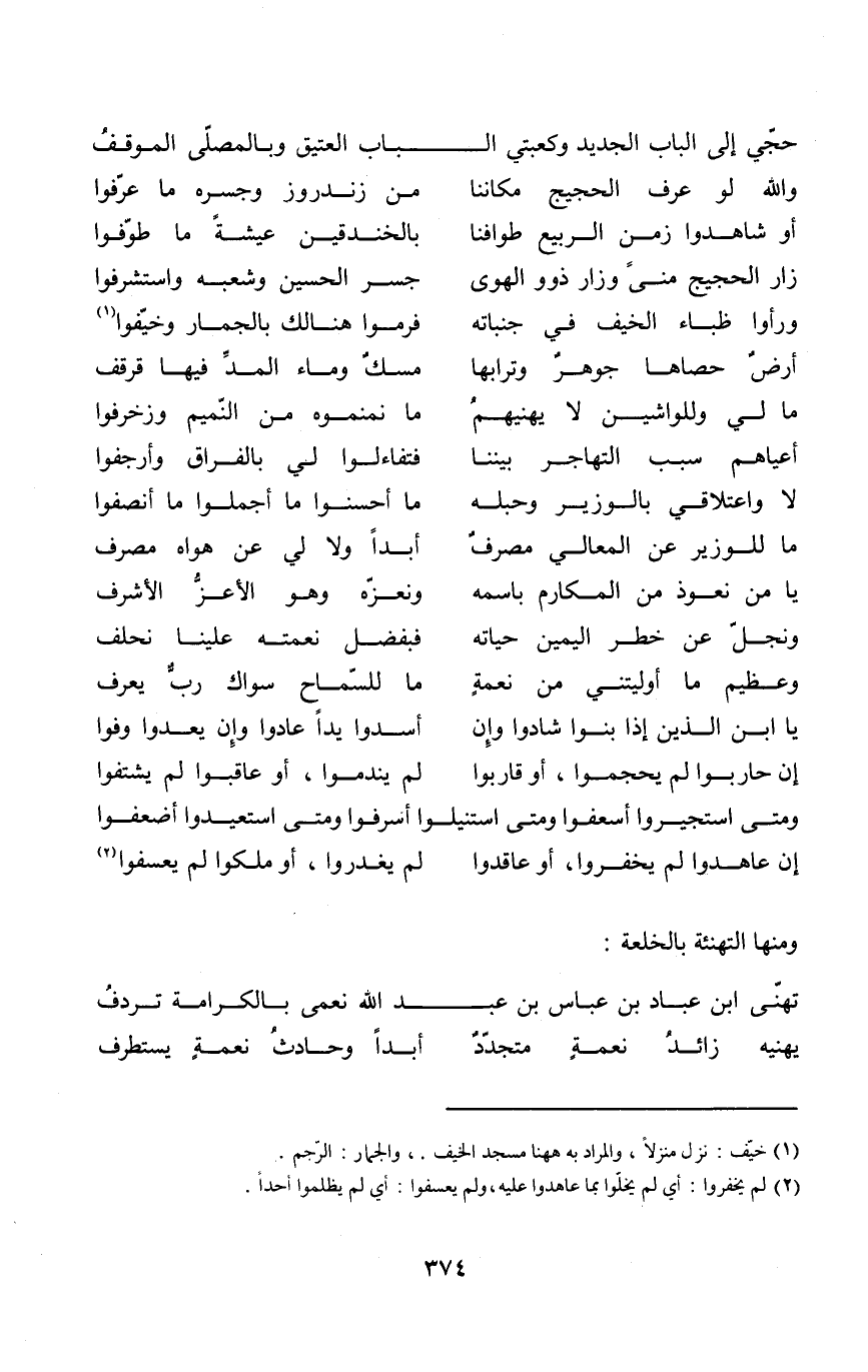 (زار الحجيج منى وزار ذَوُو الْهوى ... جسر الْحُسَيْن وشعبه واستشرفوا)