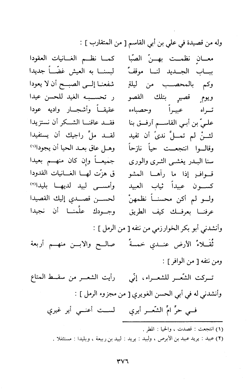 (عَليّ بن أبي الْقَاسِم ارْفُقْ بِنَا ... فقد عاقنا الشُّكْر أَن نستزيدا)