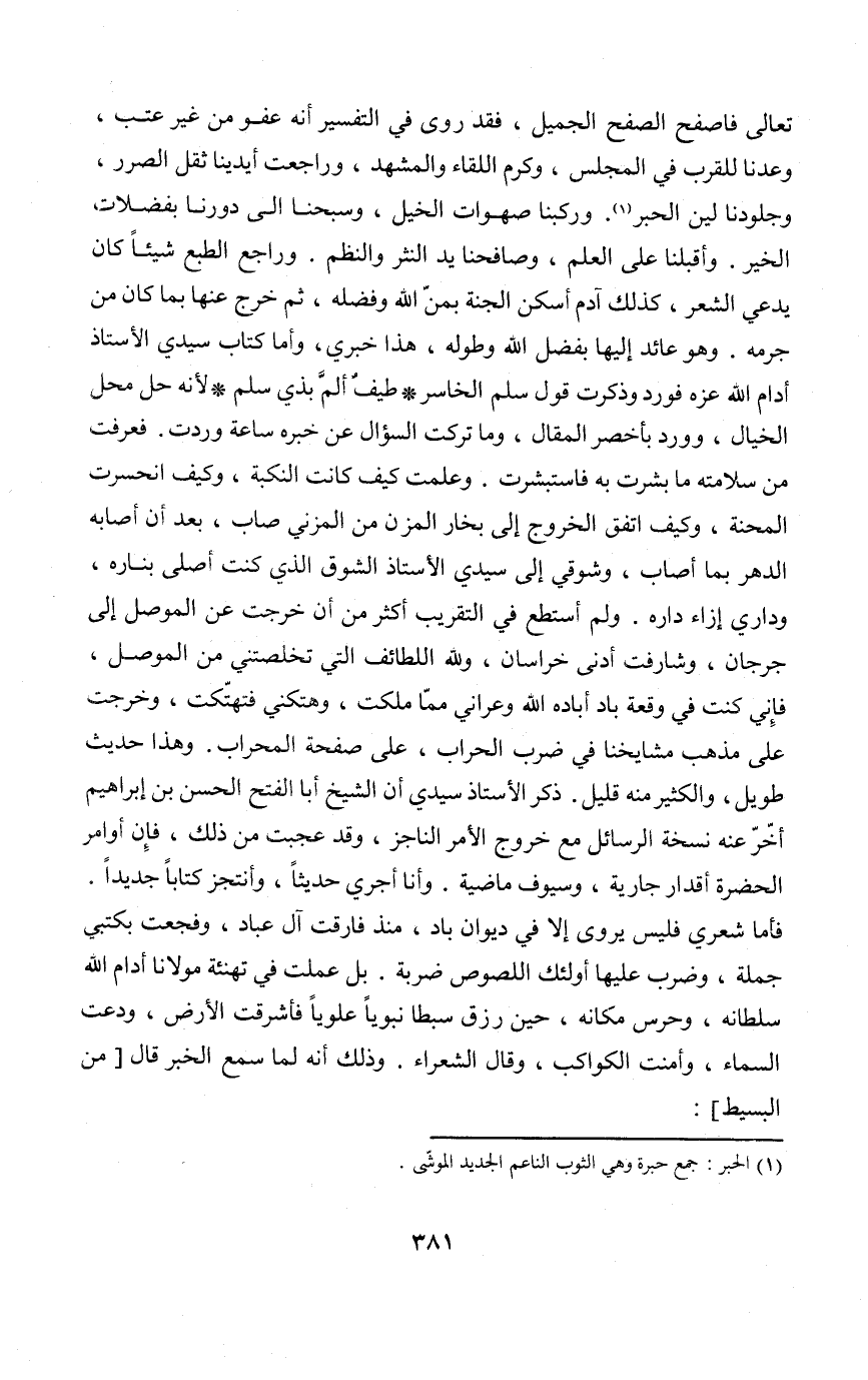 وراجع الطَّبْع شَيْئا كَانَ يدعى الشّعْر كَذَلِك آدم أسكن الْجنَّة بِمن الله وفضله ثمَّ خرج عَنْهَا بِمَا كَانَ من جرمه وَهُوَ عَائِد إِلَيْهَا بِفضل الله وَطوله هَذَا خبري وَأما كتاب سَيِّدي الْأُسْتَاذ أدام الله عزه فورد وَذكرت قَول سلم الخاسر طيف ألم بِذِي سلم لِأَنَّهُ حل مَحل الخيال وَورد بأخصر الْمقَال وَمَا تركت السُّؤَال عَن خَبره سَاعَة وَردت