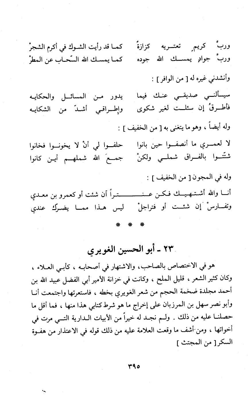 هُوَ فِي الإختصاص بالصاحب والإشتهار فِي أَصْحَابه كَأبي الْعَلَاء وَكَانَ كثير الشّعْر قَلِيل الْملح وَكَانَت فِي خزانَة الْأَمِير أبي الْفضل عبيد الله بن أَحْمد مجلدة ضخمة الحجم من شعر الغويري بِخَطِّهِ فاستعرتها وَاجْتمعت أَنا وَأَبُو نصر سهل بن الْمَرْزُبَان على إِخْرَاج مَا هُوَ شَرط كتابي هَذَا مِنْهَا فَمَا أقل مَا حصلنا عَلَيْهِ من ذَلِك