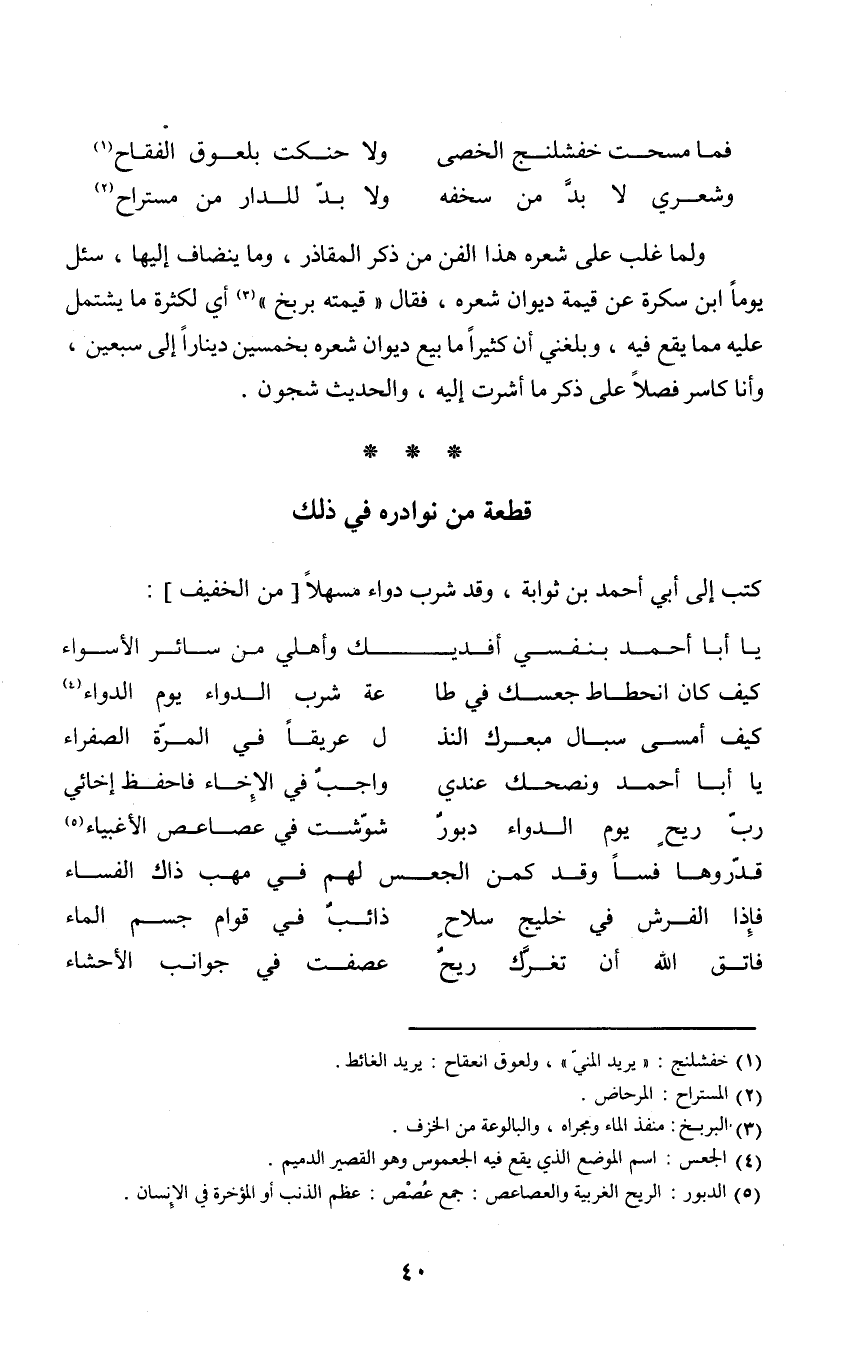 وَلما غلب على شعره هَذَا الْفَنّ من ذكر المقاذر وَمَا ينضاف إِلَيْهَا وَسُئِلَ يَوْمًا ابْن سكرة عَن قيمَة ديوَان شعره فَقَالَ قِيمَته بربخ أَي لِكَثْرَة مَا يشْتَمل عَلَيْهِ مِمَّا يَقع فِيهِ وَبَلغنِي أَن كثيرا مَا بيع ديوَان شعره بِخَمْسِينَ دِينَارا إِلَى سبعين وَأَنا كاسر فصلا على ذكر مَا أَشرت إِلَيْهِ والْحَدِيث شجون