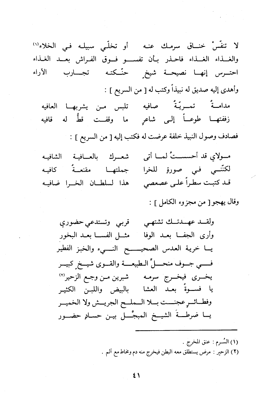 (والغذاء الْغذَاء فاحذر بِأَن تفسو ... فَوق الْفراش بعد الْغذَاء)