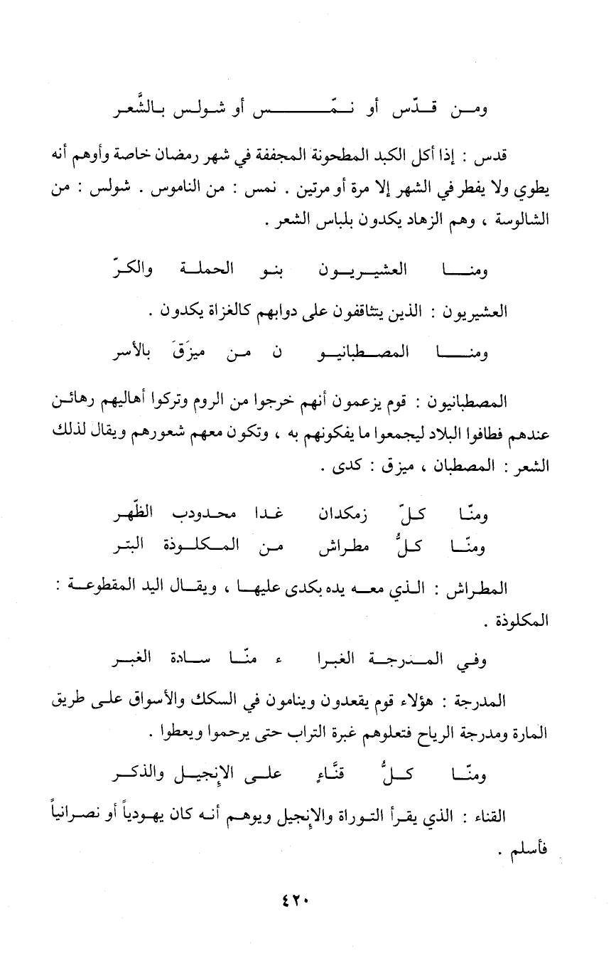 قدس إِذا أكل الكبد المطحونة المجففة فِي شهر رَمَضَان خَاصَّة وأوهم أَنه يطوي وَلَا يفْطر فِي الشَّهْر إِلَّا مرّة أَو مرَّتَيْنِ نمس من الناموس شولس من الشالوسة وهم الزهاد يكدون بلباس الشّعْر