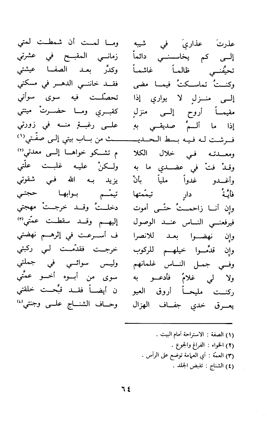 (يعرق خدي جفاف الهزال ... وحاف الشناج على وجنتي)