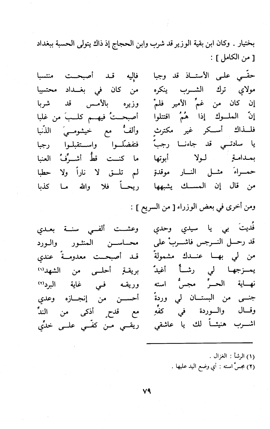 (مولَايَ ترك الشّرْب يُنكره ... من كَانَ فِي بَغْدَاد محتسبا)