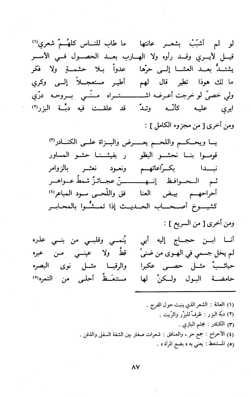 (لَو لم أشبب بِشعر عانتها ... مَا طَابَ للنَّاس كلهم شعري)