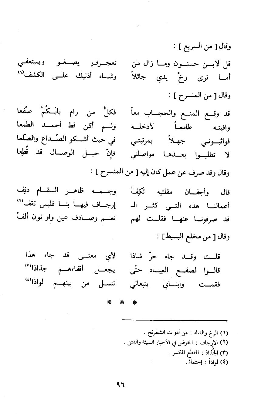 (قد صرفونا عَنْهَا فَقلت لَهُم ... نعم وصادف عين وَاو نون ألف) // المنسرح //