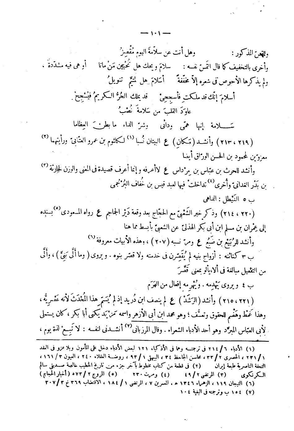 وأنشد مكان ع البيتان نسبا لكلثوم بن عمرو العتابي ورأيتهما معزوين لمحمود بن الحسن الوراق أيضا وأنشد للحرث بن عباس بن مرداس ع لا أعرفه وإنما أعرف قصيدة في المعنى والوزن لحارثة بد بدر الغذاني وأخرى تداخلت فيها لعبد قيس بن خفاف البرجمي ب5 النيطل: الداهي وذكر خبر الشعبي مع الحجاج بعد وقعة دير الجماجم ع رواه المسعودي بسنده إلى عمران بن مسلم ابن أبي بكرالهذلي عن الشعبي بأبسط مما هنا وأنشد للربيع بن ضبع ع ومر نسبه، وهذه الأبيات معروفة ب3 كنائنه: أزواج بنيه لم يقصرن في خدمته ولا قصر بنوه. ويروى وما ألي بني، وألى من التفعيل مبالغة في ألا يألو بمعنى قصر ب4 ويروى يهدمه. ويهرمه إفعال من الهرم وأنشد الرشد ع لم ينصف ابن دريد إذ لم يسم هذا المحدث لأنه عصريه، وهذا غمط وهضم للحقوق وتعسف؛ وهو محمد ابن أبي الأزهر واسمه مزيد يكنى أبا بكر، كان يستملى لأبي العباس المبرد وهو أحد الأدباء الشعراء. وقال المرزباني أنشدني لنفسه: لا تبع لذة يوم،