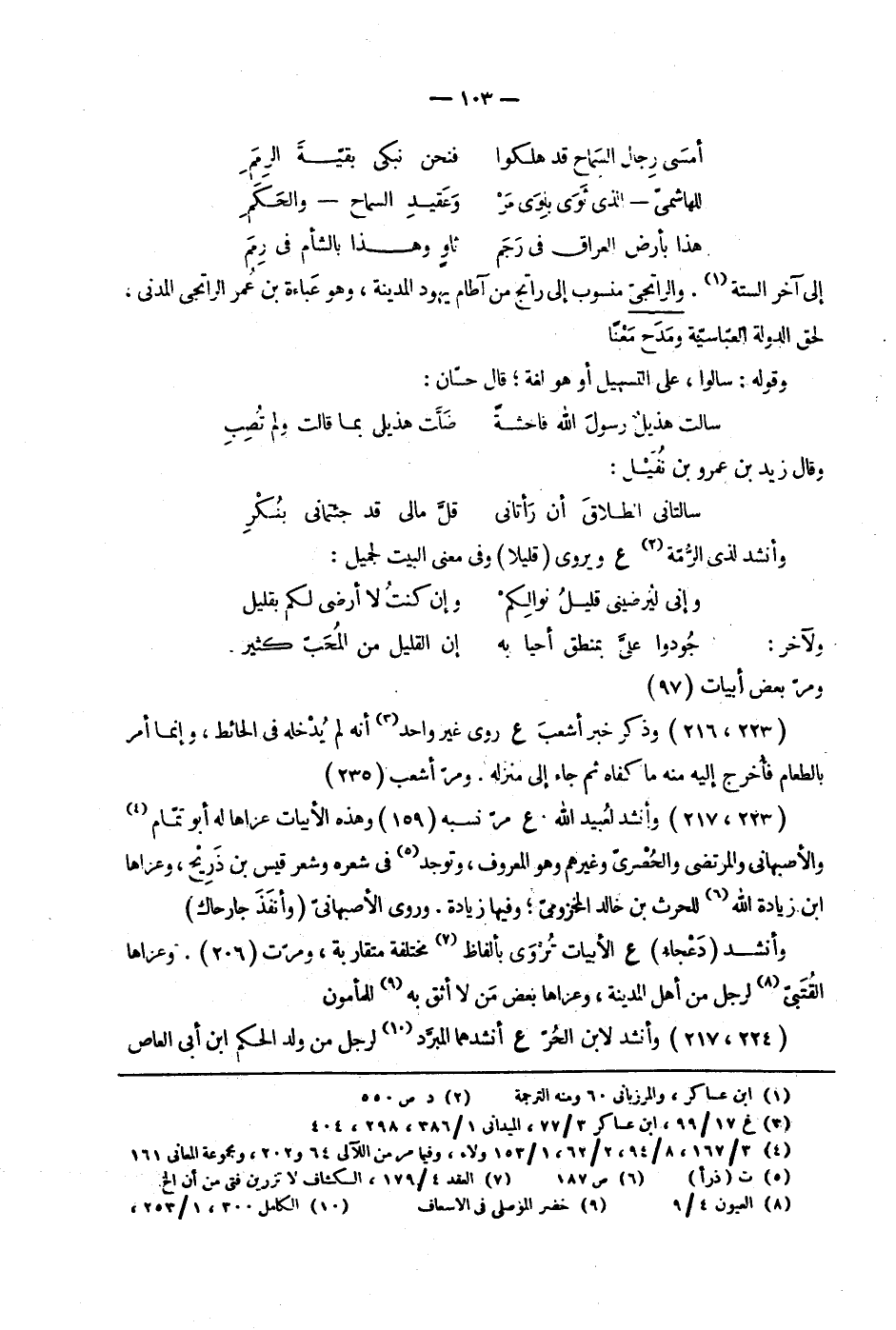 ومر بعض أبيات وذكر خبر أشعب ع روى غير واحد أنه لم يدخله في الحائط، وإنما أمر بالطعام فأخرج إليه منه ما كفاه ثم جاء إلى منزله. ومر أشعب وأنشد لعبيد الله ع مر نسبه وهذه الأبيات عزاها له أبو تمام والأصبهاني والمرتضي والحصري وغيرهم وهو المعروف، وتوجد في شعره وشعر قيس بن ذريح، وعزاها ابن زيادة الله للحرث بن خالد المخزومي؛ وفيها زيادة. وروى الأصبهاني وأنفذ جارحاك وأنشد دعجاء ع الأبيات تروى بألفاظ مختلفة متقاربة، ومرت. وعزاها القتبي لرجل من أهل المدينة، وعزاها بعض من لا أثق به للمأمون وأنشد لابن الحر ع أنشدهما المبرد لرجل من ولد الحكم ابن أبي العاص