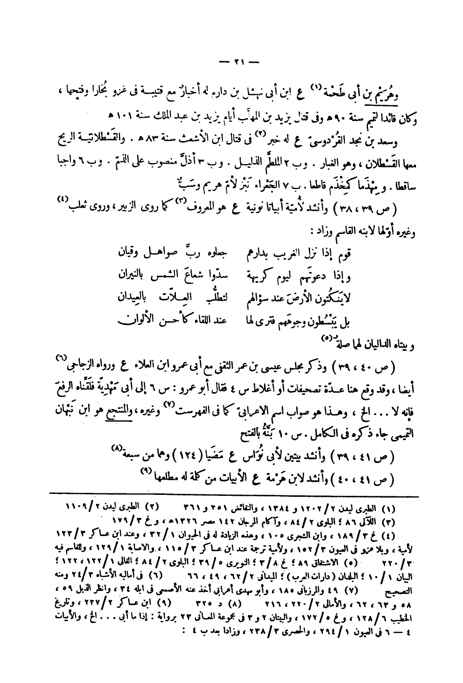 وهريم بن أبي طحمة ع ابن أبي نهشل بن دارم له أخبار مع قتيبة في غزو بخارا وفتحها، وكان قائدا لتميم سنة 90هـ وفي قتال يزيد بن المهلب أيام يزيد بن عبد الملك سنة 101هـ وسعد بن نجد القردوسي ع له خبر في قتال ابن الأشعث سنة 83هـ. والقسطلانية الريح معها القسطلان، وهو الغبار. وب2 الملطم الذليل. وب3 أذل منصوب على الذم. وب6 واجبا ساقطا. ومهذما كمخذم قاطعا. ب7 الجعراء نبز لأم هريم وسب وأنشد لأمية أبياتا نونية ع هو المعروف كما روى الزبير، وروى ثعلب وغيره أولها لابنه القاسم وزاد: