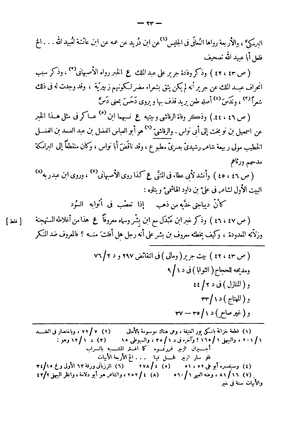البرمكي، والأربعة رواها المعافي في الجليس عن ابن دريد عن عمه عن ابن عائشة لعبيد الله ... الخ فلعل أبا عبيد الله تصحيف وذكر وفادة جرير على عبد الملك ع الخبر رواه الأصبهاني، وذكر سبب انحراف عبد الملك عن جرير أنه لم يكن يثق بشعراء مضر لكونهم زبيرية، وقد وجدت له في ذلك شعراً، وندس أصله طعن يريد قذف بها ويروى دحس بمعنى دس وذكر وفاة الرقاشي وبيتيه ع نسبهما ابن عساكر في مثل هذا الخبر عن اسمعيل بن نوبخت إلى أبي نواس. والرقاشي هو أبو العباس الفضل بن عبد الصمد بن الفضل الخطيب مولى ربيعة شاعر رشيدي بصري مطبوع، وقد ناقض أبا نواس، وكان منقطعاً إلى البرامكة مدجهم ورثاهم وأنشد لأبي عطاء في المثني ع كذا روى الأصبهاني، وروى ابن عبد ربه البيت الأول لشاعر في علي بن داود الهاشمي ويتلوه: