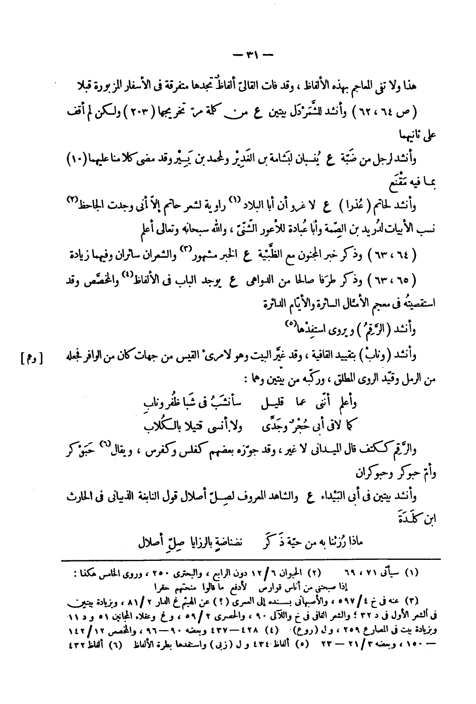 هذا ولا تفي المعاجم بهذه الألفاظ، وقد فات القالي ألفاظ تجدها متفرقة في الأسفار المزبورة قبلا وأنشد للشمر دل بيتين ع من كلمة تخريجها ولكن لم أقف على ثانيهما وأنشد لرجل من ضبة ع ينسبان لبشامة بن الغدير ولمحمد بن يسير وقد مضى كلامنا عليهما بما فيه مقنع وأنشد لحاتم عذرا ع لا غرو أن أبا البلاد راوية لشعر حاتم إلا أني وجدت الجاحظ نسب الأبيات لدريد بن الصمة وأبا عبادة للأعور الشنى، والله سبحانه وتعالى أعلم وذكر خبر المجنون مع الظبية ع الخبر مشهور والشعران سائران وفيهما زيادة وذكر طرفا صالحا من الدواهي ع يوجد الباب في الألفاظ والمخصص وقد استقصيته فيمعجم الأمثال السائرة والأيام الدائرة وأنشد الرقم ويروى استفدها وأنشد وناب بتقييد القافية، وقد غير البيت وهو لامرىء القيس من جهات كان من الوافر فجعله من الرمل وقيد الروى المطلق، وركبه من بيتين وهما: