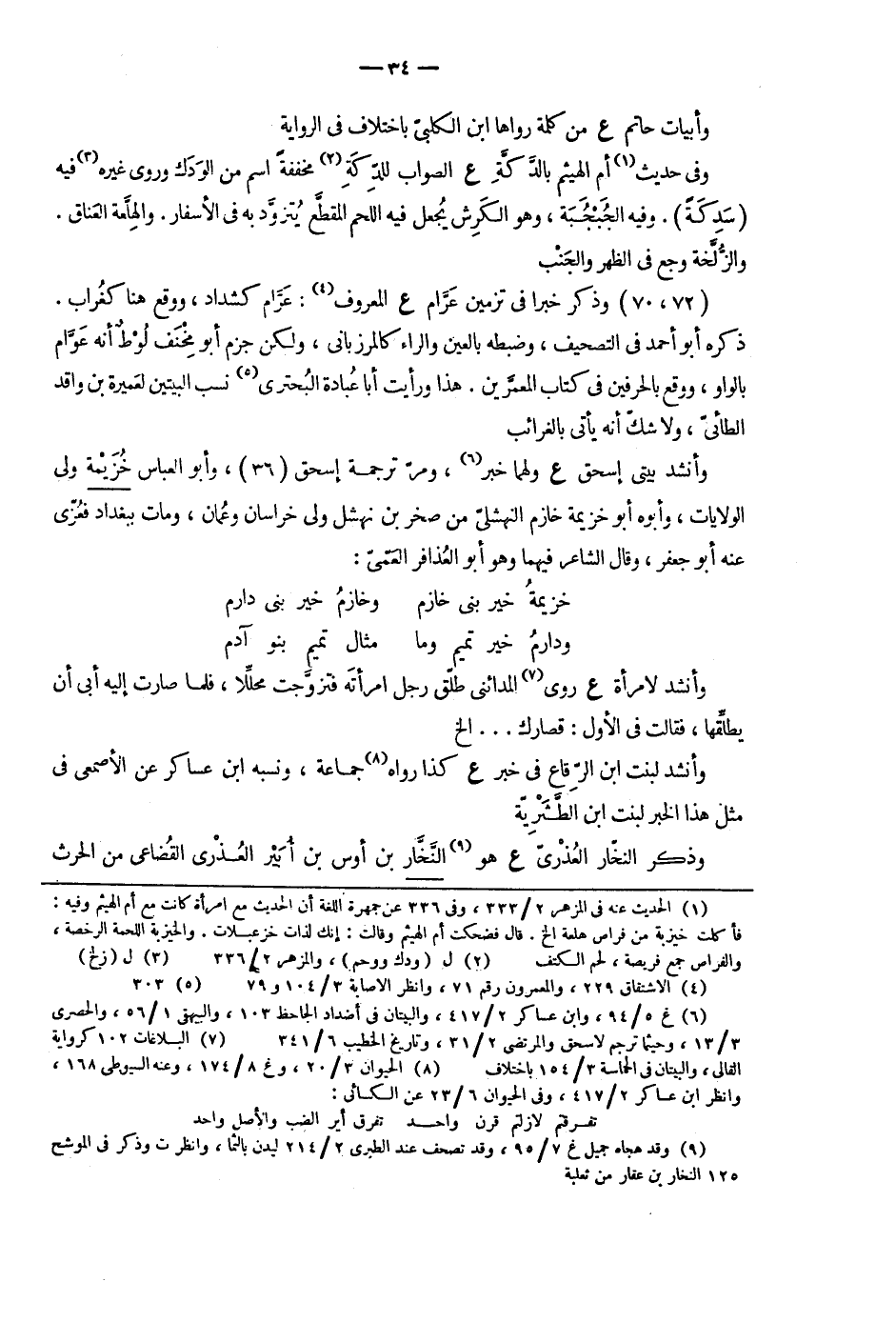 وأبيات حاتم ع من كلمة رواها ابن الكلبي باختلاف في الرواية وفي حديث أم الهيثم بالدكة ع الصواب للدكة مخففة اسم من الودك وروى غيره فيه سدكة. وفيه الجبجبة، وهو الكرش يجعل فيه اللحم المقطع يتزود به في الأسفار. والهلعة العناق. والزلخة وجع في الظهر والجنب وذكر خبرا في تزمين عرام ع المعروف: عرام كشداد، ووقع هنا كغراب. ذكره أبو أحمد في التصحيف، وضبطه بالعين والراء كالمرزباني، ولكن جزم أبو مخنف لوط أنه عوام بالواو، ووقع بالحرفين في كتاب المعمرين. هذا ورأيت أبا عبادة البحتري نسب البيتين لعميرة بن واقد الطائي، ولا شك أنه يأتي بالغرائب وأنشد بيتي إسحق ع ولهما خبر، ومر ترجمة إسحق، وأبو العباس خزيمة ولي الولايات، وأبوه أبو خزيمة خازم النهشلي من صخر بن نهشل ولي خراسان وعمان، ومات ببغداد فعزى عنه أبو جعفر، وقال الشاعر فيهما وهو أبو العذافر العمي: