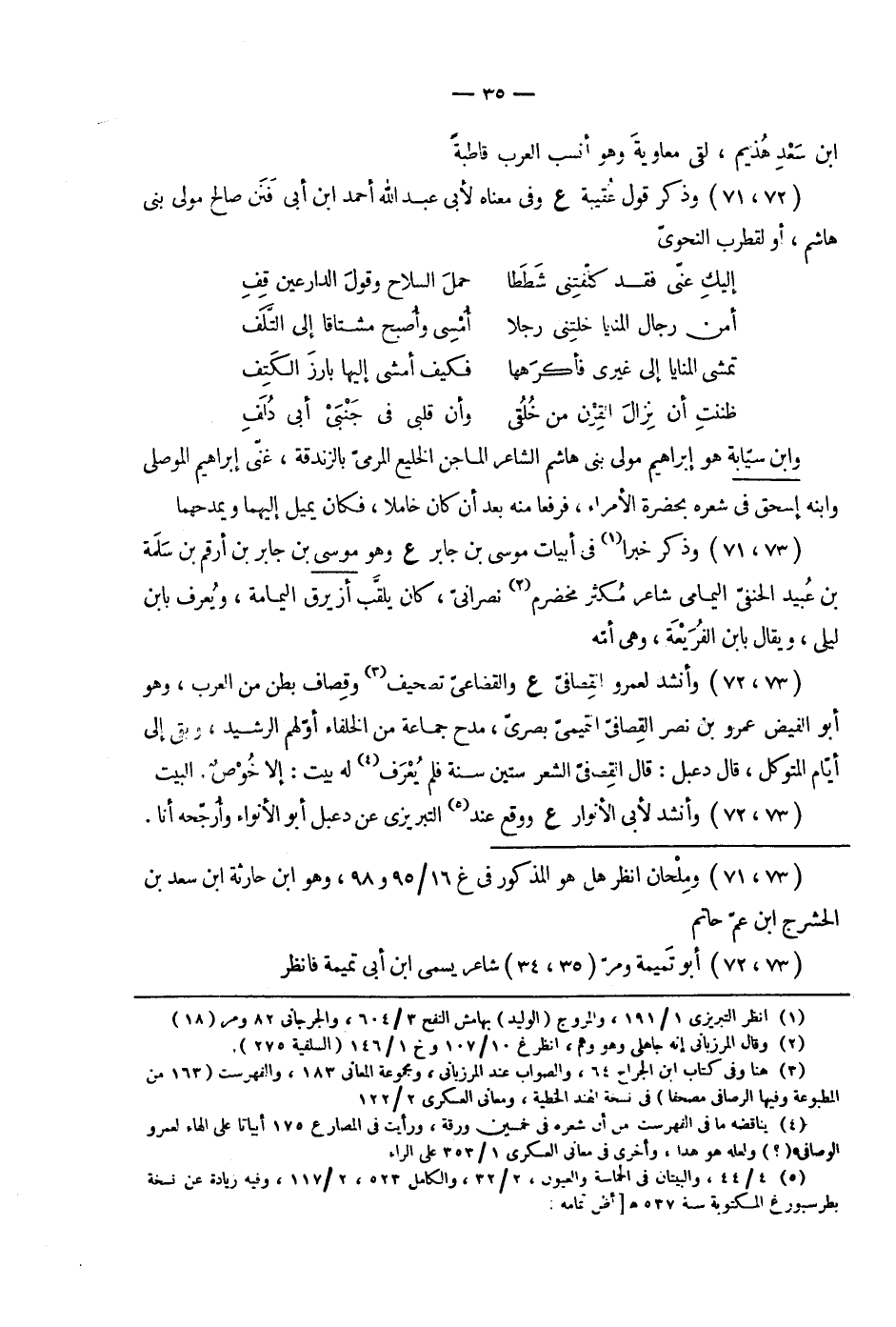 وابن سيابة هو إبراهيم مولى بني هاشم الشاعر الماجن الخليع المرمي بالزندقة، غني إبراهيم الموصلي وابنه إسحق في شعره بحضرة الأمراء، فرفعا منه بعد أن كان خاملا، فكان يميل إليهما ويمدحهما وذكر خبرا في أبيات موسى بن جابر ع وهو موسى بن جابر بن أرقم بن سلمة بن عبيد الحنفي اليمامي شاعر مكثر مخضرم نصراني، كان يلقب أزيرق اليمامة، ويعرف بابن ليلى، ويقال بابن الفريعة، وهي أمه وأنشد لعمرو لقصافي ع والقضاعي تصحيف وقصاف بطن من العرب، وهو أبو الفيض عمرو بن نصر القصافي التميمي بصري، مدح جماعة من الخلفاء أولهم الرشيد، وبقي إلى أيام المتوكل، قال دعبل: قال القصافي الشعر ستين سنة فلم يعرف له بيت: إلا خوص. البيت وأنشد لأبي الأنوار ع ووقع عند التبريزي عن دعبل أبو الأنواء وأرجحه أنا.