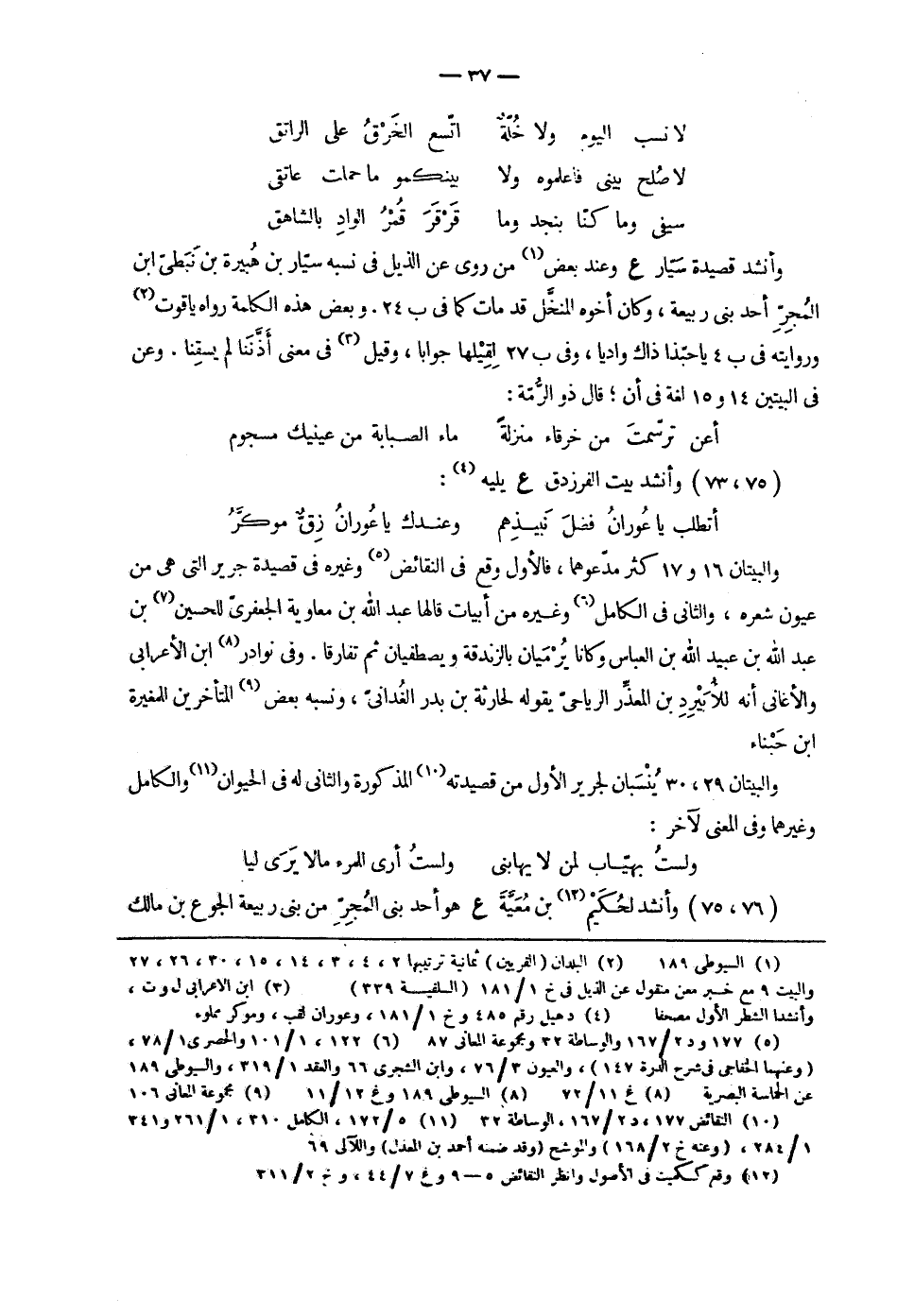 وأنشد قصيدة سيار ع وعند بعض من روى عن الذيل في نسبه سيار بن هبيرة بن نبطي ابن المجر أحد بني ربيعة، وكان أخوه المنخل قد مات كما في ب24. وبعض هذه الكلمة رواه ياقوت وروايته في ب4 يا حبذا ذاك واديا، وفي ب27 لقيلها جوابا، وقيل في معنى أذننا لم يسقنا. وعن في البيتين 14و15 لغة في أن؛ قال ذو الرمة: