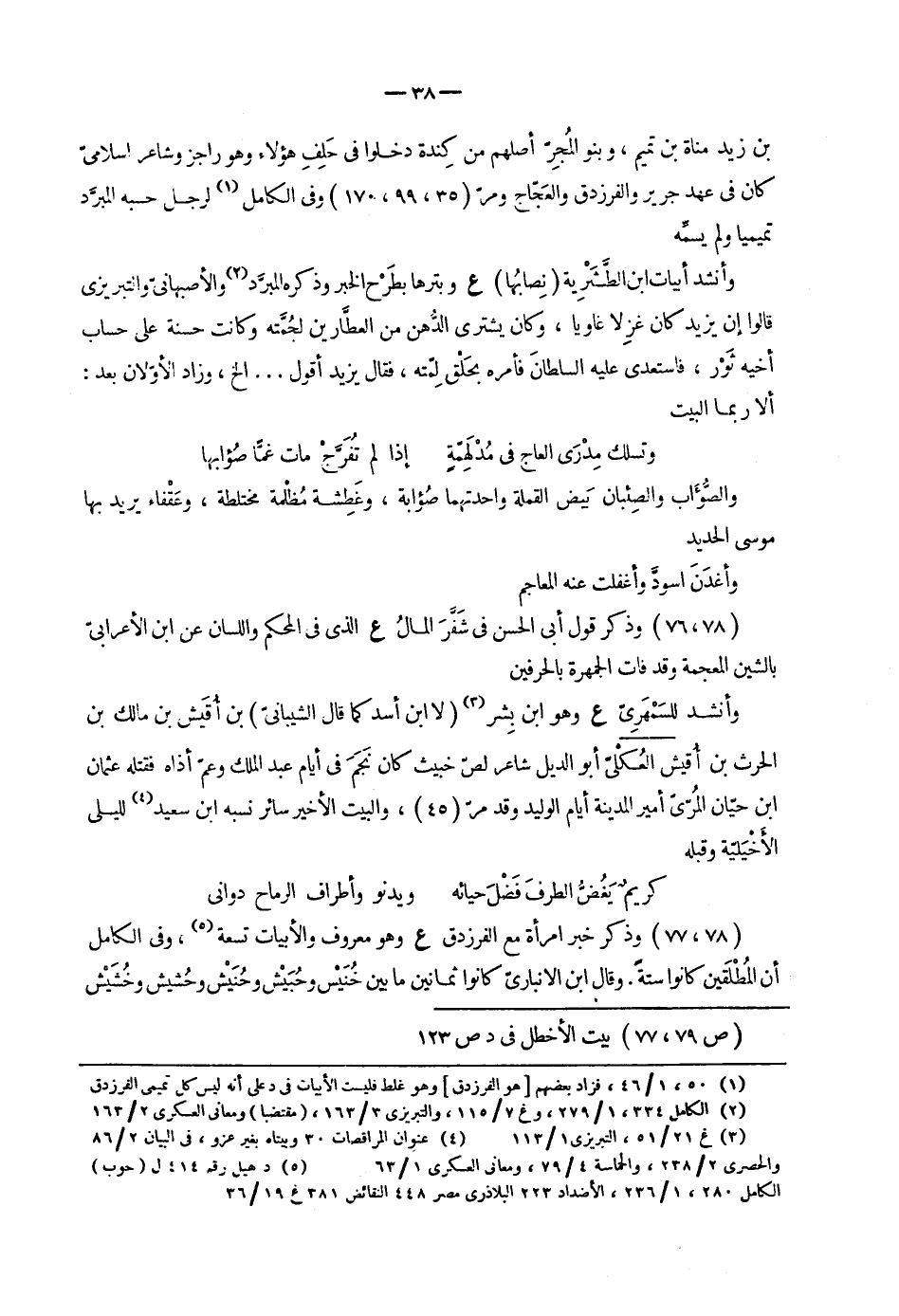 وذكر خبر امرأة مع الفرزدق ع وهو معروف والأبيات تسعة، وفي الكامل أن المطلقين كانوا ستة. وقال ابن الأنباري كانوا ثمانين ما بين خنيس وحبيش وحنيش وحشيش وخشيش