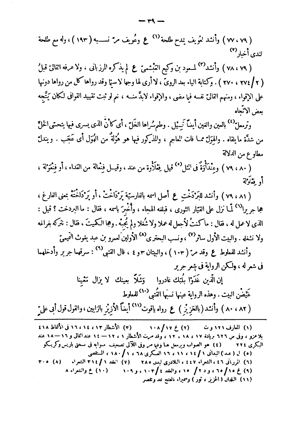 وأنشد لعويف يمدح طلحة ع وعويف مر نسبه، وله مع طلحة لندى أخبار وأنشد لمسعود بن وكيع العبشمي ع لم يذكره المرزباني، ولا عرفه القالي قبل. وكتابة الياء بعد الروى، لا أرى لها وجها لا سيما وقد رواها كل من رواها دونها على الإقواء، ومنهم القالي نفسه فيما مضى، والإقواء لابد منه، نعم لو ثبت تقييد القوافي لكان يتجه بعض الاتجاه