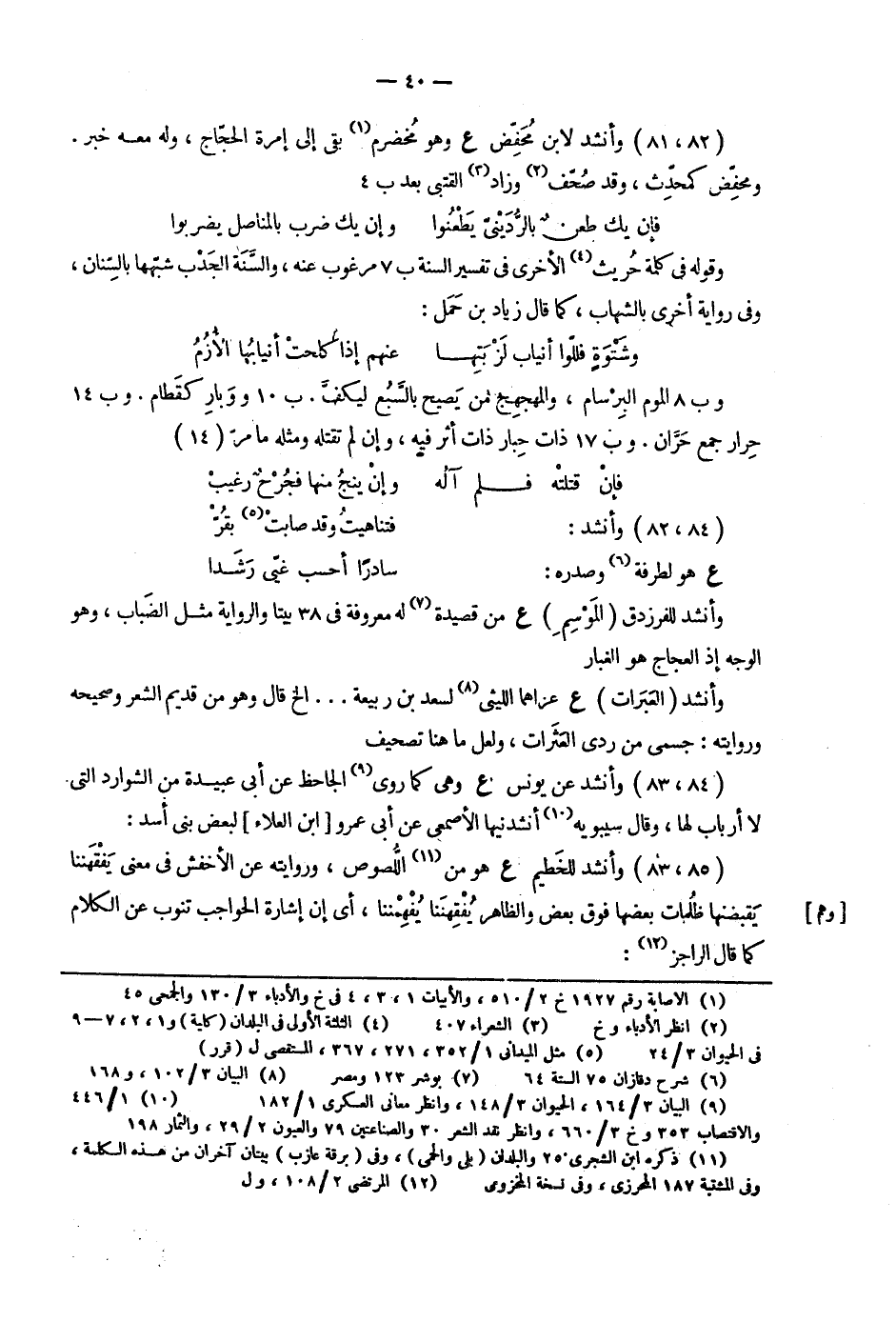 وأنشد للفرزدق الموسم ع من قصيدة له معروفة في 38 بيتا والرواية مثل الضباب، وهو الوجه إذ العجاج هو الغبار وأنشد العبرات ع عزاهما الليثي لسعد بن ربيعة ... الخ قال وهو من قديم الشعر وصحيحه وروايته: جسمي من ردى العثرات، ولعل ما هنا تصحيف وأنشد عن يونس ع وهي كما روى الجاحظ عن أبي عبيدة من الشوارد التي لا أرباب لها، وقال سيبويه أنشدنيها الأصمعي عن أبي عمرو ابن العلاء لبعض بني أسد: وأنشد للخطيم ع هو من اللصوص، وروايته عن الأخفش في معنى يفقهننا يقيضنها ظلمات بعضها فوق بعض والظاهر يفقهننا يفهمننا، أي إن إشارة الحواجب تنوب عن الكلام كما قال الراجز: