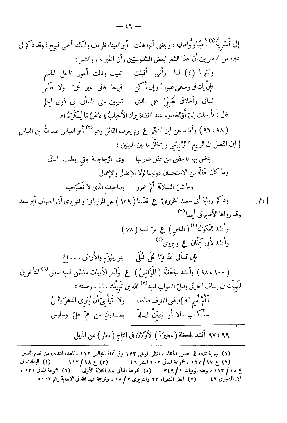 وذكر رواية أبي سعيد المخزومي ع قدمنا عن المرزباني والنويري أن الصواب أبو سعد وقد رواها الأصبهاني أيضا وأنشد للعكوك الناس ع مر نسبه وأنشد لأبي هفان ع ويروى