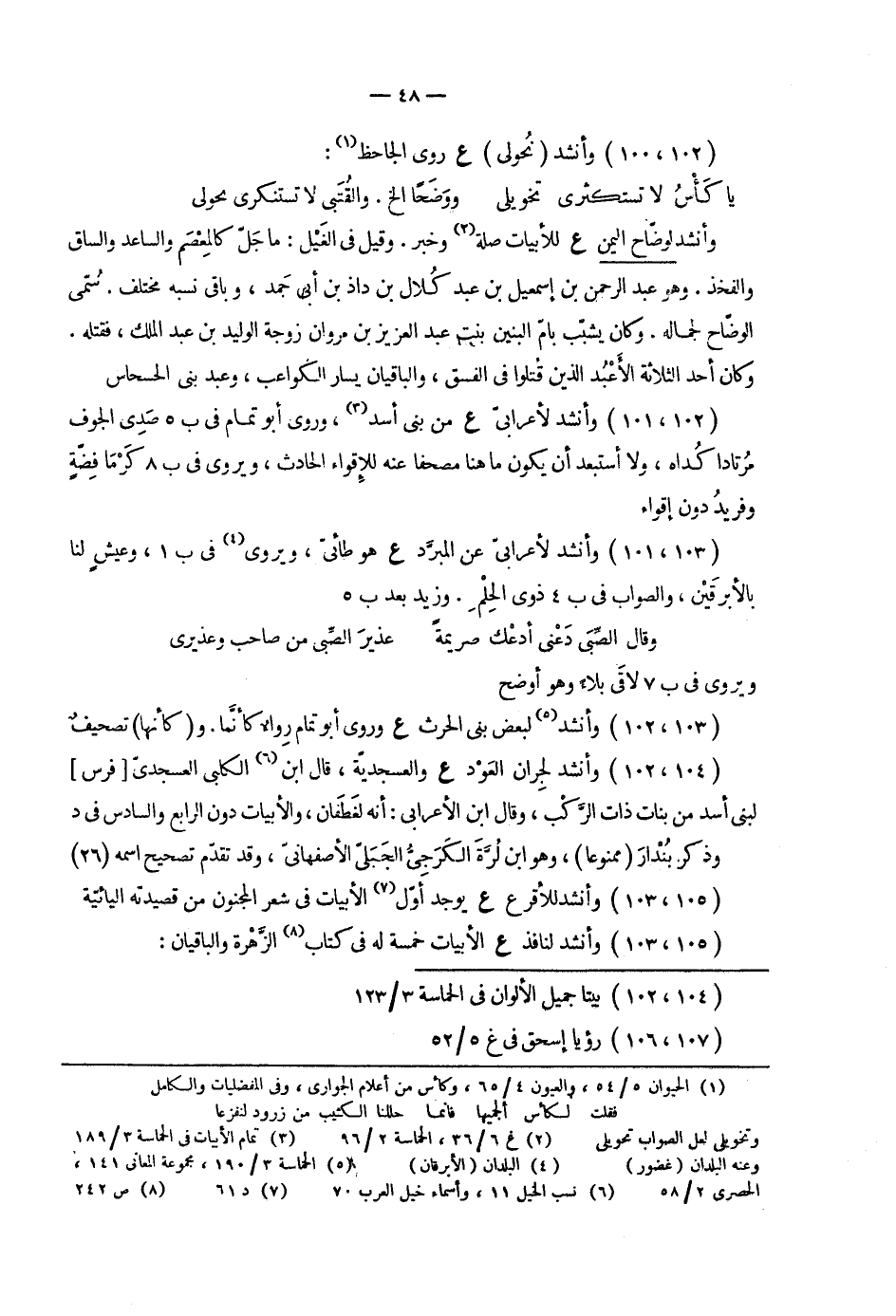 ويروى في ب لاقى بلاء وهو أوضح وأنشد لبعض بنى الحرث ع وروى أبو تمام رواء كأنما. وكأنها تصحيف وأنشد لجران العود ع والعسجدية، قال ابن الكلبي العسجدي فرس لبنى أسد من بنات ذات الركب، وقال ابن الأعرابي: أنه لغطفان، والأبيات دون الرابع والسادس في د وذكر بندار ممنوعا، وهو ابن لرة الكرجي الجبلي الأصفهاني، وقد تقدم تصحيح اسمه وأنشد للأقراع ع يوجد أول الأبيات في شعر المجنون من قصيدته اليائية وأنشد لنافذ ع الأبيات خمسة له في كتاب الزهرة والباقيان: