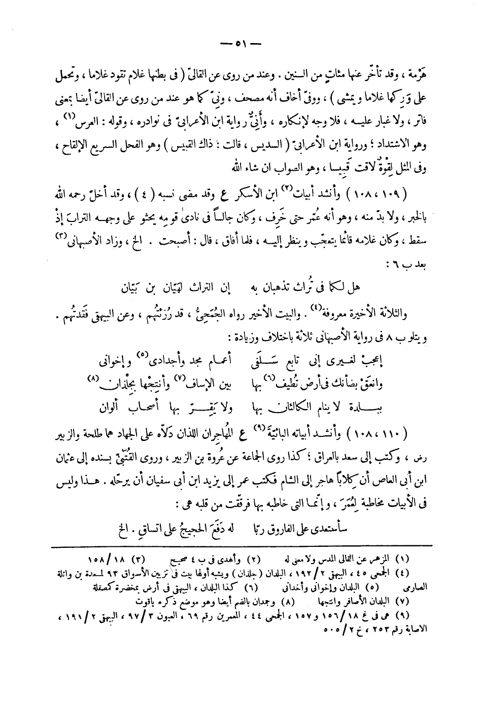 هرمة، وقد تأخر عنها مئات من السنين. وعند من روى عن القالي في بطنها غلام تقود غلاما، وتحمل على وركها غلاما ويمشي، ووفى أخاف أنه مصحف، ونى كما هو عند من روى عن القالي أيضاً بمعنى فاتر، ولا غبار عليه، فلا وجه لإنكاره، وأنى رواية ابن الأعرابي في نوادره، وقوله: العرس، وهو الاشتداد؛ ورواية ابن الأعرابي السديس، قالت: ذاك القبيس وهو الفحل السريع الإلقاح وفي المثل لقوة لاقت قبيسا، وهو الصواب أن شاء الله وأنشد أبيات ابن الأسكر ع وقد مضى نسبه، وقد أخل رحمه الله بالخبر، ولا بد منه، وهو أنه عمر حتى خرف، وكان جالساً في نادى قومه يحثو على وجهه التراب إذ سقط، وكان غلامه قائما يتعجب وينظر وينظر إليه، فلما أفاق، قال: أصبحت. الخ، وزاد الأصبهاني بعد ب6: