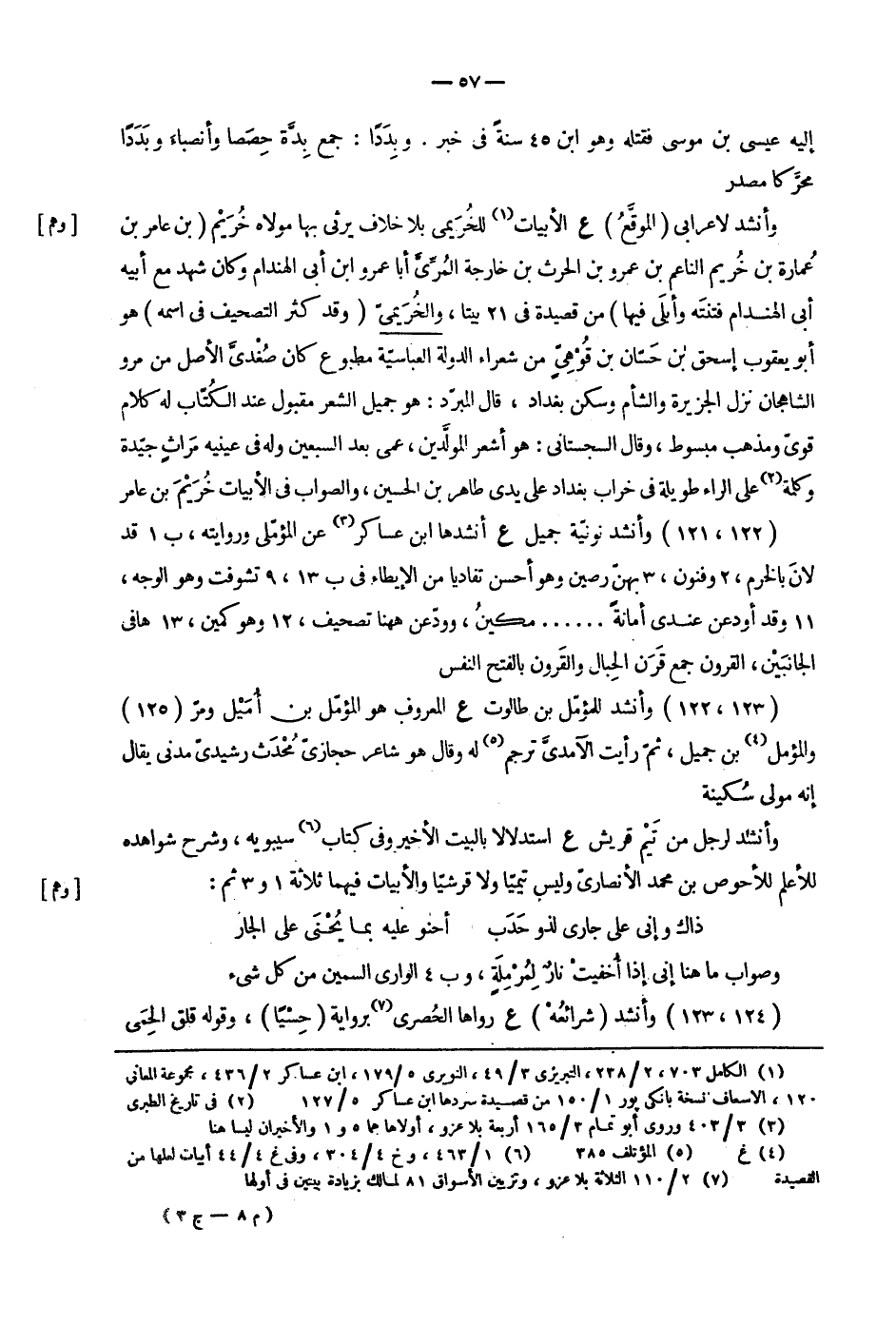 وأنشد لأعرابي الموقع ع الأبيات للخريمى بلا خلاف يرثى بها مولاه خريم بن عامر بن عمارة بن خريم الناعم بن عمرو بن الحرث بن خارجة المرى أبا عمرو ابن أبي الهندام وكان شهد مع أبيه أبي الهندم فتنته وأبلى فيها من قصيدة في 21 بيتا، والخزيميى وقد كثر التصحيف في اسمه هو أبو يعقوب إسحق بن حسان بن قوهى من شعراء الدولة العباسية مطبوع كان صغدى الأصل من مرو الشاهجان نزل الجزيرة والشأم وسكن بغداد، قال المبرد: هو جميل الشعر مقبول عند الكتاب له كلام قوى ومذهب مبسوط، وقال السجستاني: هو أشعر المولدين، عمى بن السبعين وله في عينيه مراث جيدة وكلمة على الراء طويلة في خراب بغداد على يدي طاهر بن الحسين، والصواب في الأبيات خريم بن عامر 122، 121 وأنشد نونية جميل ع أنشدها ابن عساكر عن المؤملي وروايته، ب1 قد لان بالخرم، وفنون، بهن رصين وهو أحسن تفاديا من الإيطاء في ب13، تشوفت وهو الوجه، وقد أودعن عندي أمانة مكين، وودعن ههنا تصحيف، وهو كمين، ها في الجانبين، القرون جمع قرن الحبال والقرون بالفتح النفس.