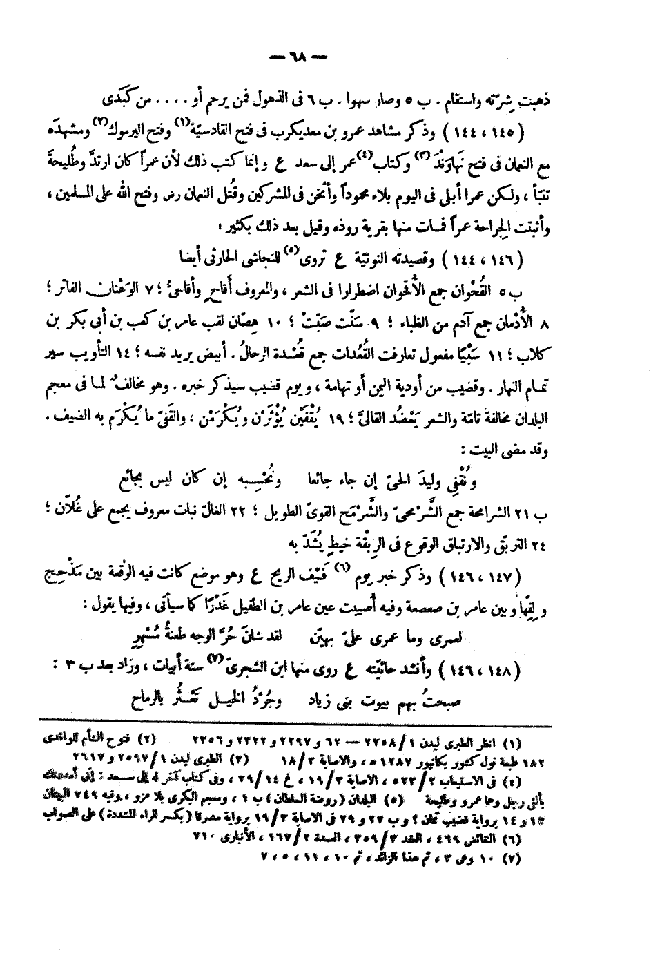 ب 21 الشرامحة جمع الشرمحي والشرمح القوي الطويل؛ 22 الغال نبات معروف يجمع على غلان؛ 24 التربق والأرتباق الوقوع في الربقة خيط يشد به وذكر خبر يوم فيف الريح ع وهو موضع كانت فيه الوقعة بين مذحج ولفها وبين عامر بن صعصة وفيه أصيبت عين عامر بن الطفيل غدراً كما سيأتي، وفيها يقول: