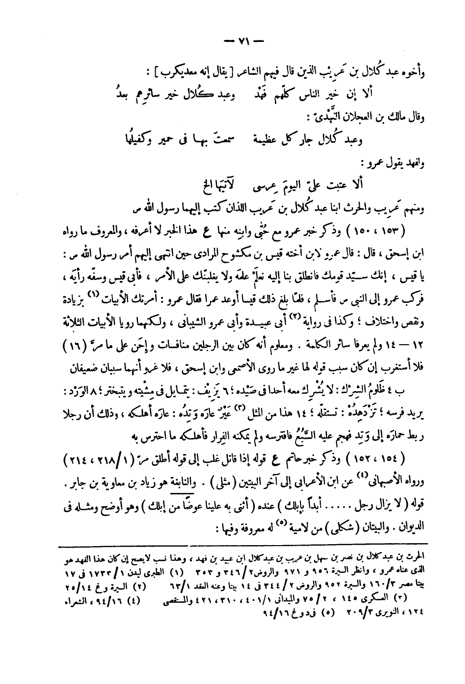 ومنهم عريب والحرث ابنا عبد كلال بن عريب اللذان كتب إليهما رسول الله 153، 150 وذكر خبر عمرو مع حبي وابنه منها ع هذا الخبر لا أعرفه، والمعروف ما رواه ابن إسحق، قال: قال عمرو لابن أخته قيس بن مكشوح المرادى حين انتهى إليهم أمر رسول الله: يا قيس، إنك سيد قومك فانطلق بنا إليه نعلم علمه ولا يغلبنك على الأمر، فأبى قيس وسفه رأيه، فركب عمرو إلى النبي فأسلم، فلما بلغ ذلك قيساً أو عد عمرا فقال عمرو: أمرتك الأبيات بزيادة ونقص واختلاف؛ وكذا في رواية أبي عبيدة وابي عمرو الشيباني، ولكنهما رويا الأبيات الثلاثة ولم يعرفا سائر الكملة. ومعلوم أنه كان بين الرجلين منافسات وإحن على ما مر فلا أستغرب إن كان سبب قوله لها غير ما روى الأصمعي وابن إسحق، فلا غرو أنهما سببان ضعيفان ب4 ظلوم الشرك: لا يشرك معه أحداً في صيده؛ 6 يزيف: يتمايل في مشيته ويتبختر؛ 8 الورد: يريد فرسه؛ تزدهده: تستقله؛ 14 هذا من المثل غير عاره وتده: عاره أهلكه، وذلك أن رجلا ربط حماره إلى وتد فهجم عليه السبع فافترسه ولم يمكنه الفرار فأهلكه ما احترس به.