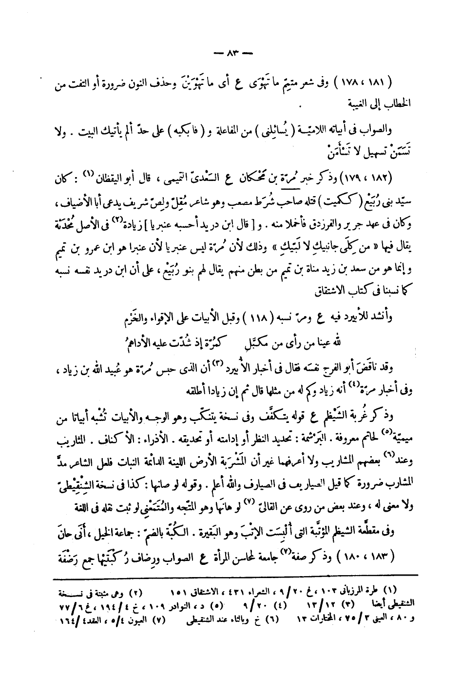وفي شعر متمم ما تهوى ع أي ما تهوين وحذف النون ضرورة أو التفت من الخطاب إلى الغيبة والصواب في أبياته اللامية يسائلني من المفاعلة وفابكيه على حد ألم يأتيك البيت. ولا تسمن تسهيل لا تسأمن