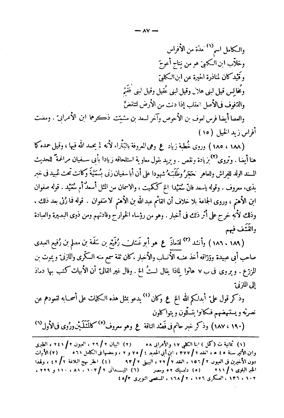 والكامل اسم لعدة من الأفراس وحلاب ابن الكلبي هو من نتاج أعوج وقيد كان لمناذرة الحيرة عن ابن الكلبي ومخالس قيل لبنى هلال وقيل لبنى عقيل وقيل لبنى فقيم والدفوف في الأصل العقاب إذا دنت من الأرض لتنقض والعصا أيضاً فرس لعوف بن الأخوص وآخر لسعد بن مشمت ذكرهما ابن الأعرابي. ومضت أفراس زيد الخيل 15 188، 185 وروى خطبة زياد ع وهي المعروفة بالبتراء لأنه لم يحمد الله فيها، وقيل حمده كما هنا أيضاً. وتروى بزيادة ونقص. ويريد بقول معاوية استلحاقه زيادا بأبي سفيان مراغمة للحديث المسند الولد للفراش وللعاهر الحجر وطلبه شهودا على أن أبا سفيان زنى بسيمة وكانت تحت عبيد في خبر بذئ معروف. وقوله يا سعد فإن سعيدا الخ ككميت، والإسمان من المثل أسعد أم سعيد. قوله صفوان ابن الأهتم، وروى الجماعة بلا خلاف أن القائم عبد الله بن الأهتم لا صفوان. قوله فما رئى بعد ذلك، وذلك لأنه خرج على أثر ذلك في أخبار. وهو من رؤساء الخوارج وقادتهم ومن ذوى البصيرة والعبادة والقشف فيهم 189، 186 وأنشد لدماذ ع هو أبو غسان رفيع بن سلمة بن مصلم بن رفيع العبدى صاحب أبي عبيدة ووراقه أخذ عنه الأنساب والأخبار، كان ثقة سمع منه السكرى والمازني ويموت بن المزرع. ويروى في ب7 هاتوا لماذا يقال لست الخ. وقال غير القالي أن الأبيات كتب بها دماذ إلى المازني ذكر قول علي أبدلكم الله اله ع وكان يدعو بمثل هذه الكلمات على أصحابه لقعودهم عن نصرته ويستنهضهم فكانوا يتسللون ويتواكلون 190، 187 وذكر خبر حاتم في فصد الناقة ع وهو معروف كالمثلين وروى في الأول