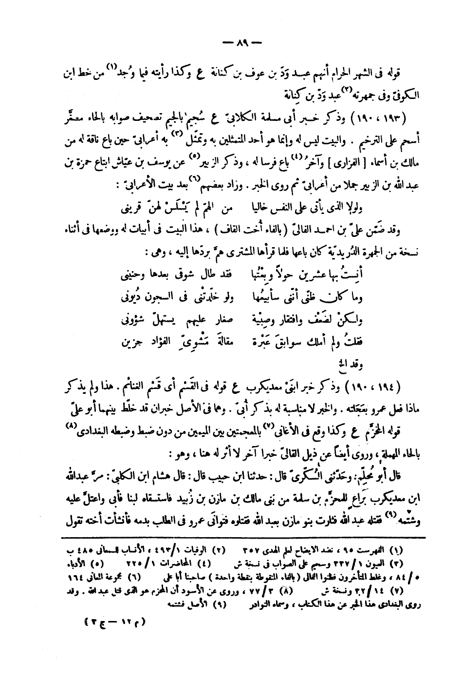 قوله في الشهر الحرام أنهم عبد ود بن عوف بن كنانة ع وكذا رأيته فيما وجد من خط ابن الكوفى وفي جمهرته عبد ود بن كنانة 193، 190 وذكر خبر أبي مسلمة الكلابي ع سجيم بالجيم تصحيف صوابه بالحاء مصغر أسحم على الترخيم. والبيت ليس له وإنما هو أحد المتمثلين به وتمثل به أعرابي حين باع ناقة له من مالك بن أسماء الفزارى وآخر باع فرسا له، وذكر الزبير عن يوسف بن عياش ابتاع حمزة بن عبد الله بن الزبير جملا من أعرابي ثم روى الخبر، وزاد بعضهم بعد بيت الأعرابي: