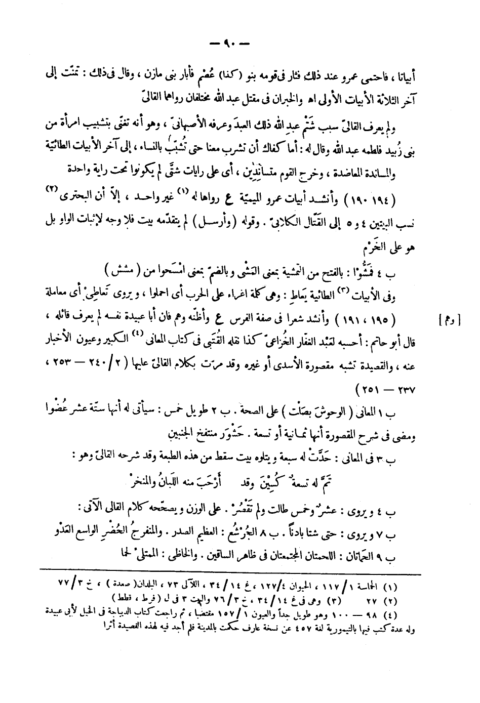 أبياتا، فاحتمىة عمرو عند ذلك فثار في قومه بنو كذا عصم فأبار بنى مازن، وقال في ذلك: تمنت إلى آخر الثلاثة الأبيات الأولى اه والخبران في مقتل عبد الله مختلفان رواهما القالي ولم يعرف القالي سبب شتم عبد الله ذلك العبد وعرفه الأصبهاني، وهو أنه تغنى بتشبيب امرأة من بنى زبيد فلطمه عبد الله وقال له: أما كفاك أن تشرب معنا حتى تشبب بالنساء، إلى آخر الأبيات الطائية والمساندة المعاضدة، وخرج القوم متساندين، أي على رايات شتى لم يكونوا تحت راية واحدة 194، 190 وأنشد أبيات عمرو الميمية ع رواها له غير واحد، إلا أن البحتري نسب البيتين 4 و5 إلى القتال الكلابي. وقوله وأرسل لم يتقدمه بيت فلا وجه لإثبات الواو بل هو على الخرم ب4 فمشوا: بالفتح من التمشية بمعنى المشى وبالضم بمعنىن امسحوا من مشش وفي الأبيات الطائية يعاط: وهي كلمة اغراء على الحرب أي احملوا، ويروى تعاطى أي معاملة