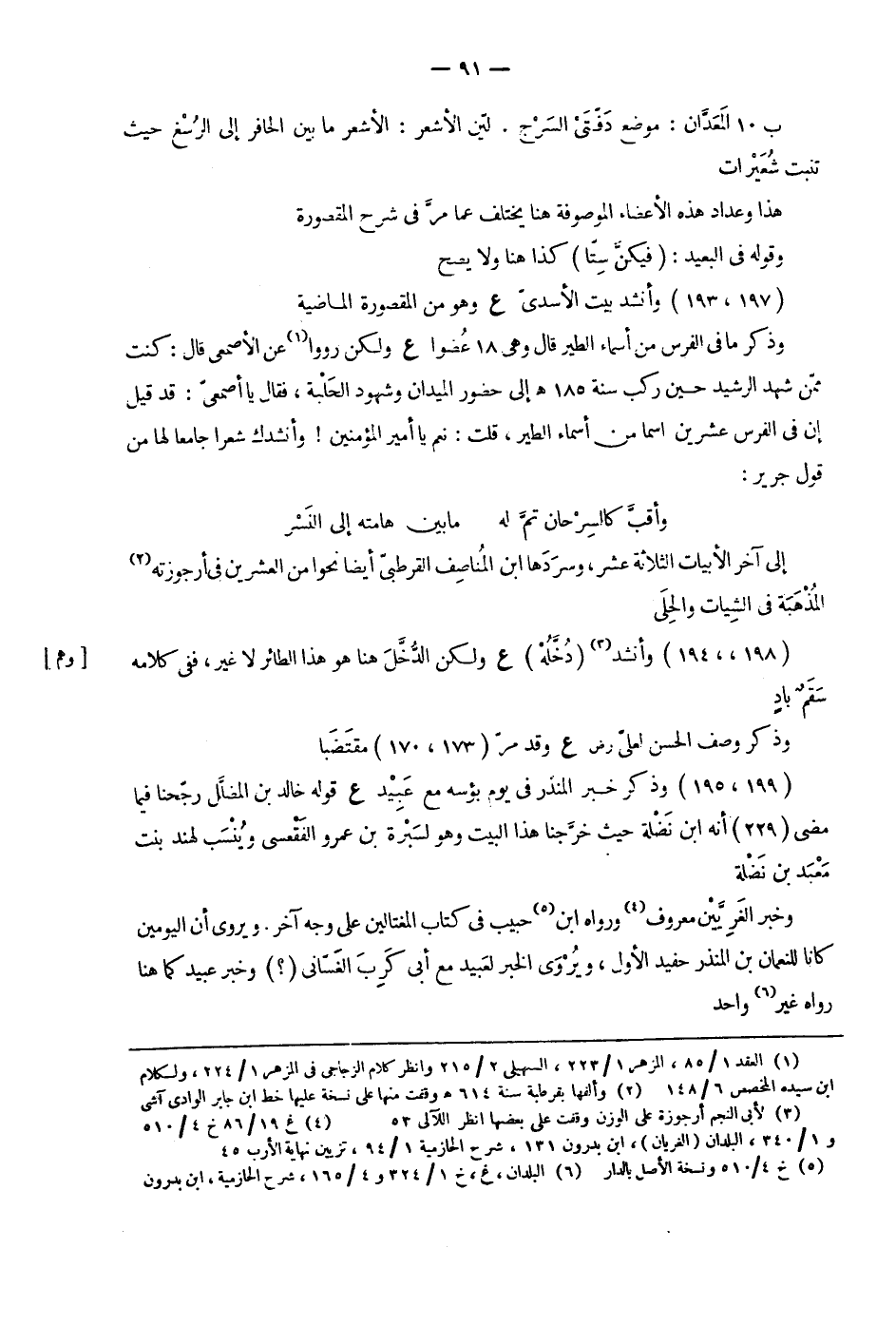 ب10 المعدان: موضع دفتي السرج. لين الأشعر: الأشعر ما بين الحافر إلى الرسغ حيث تنبت شعيرات هذا وعداد هذه الأعضاء الموصوفة هنا يختلف عما مر في شرح المقصورة وقوله في البعيدة: فيكن ستاً كذا هنا ولا يصح 197، 193 وأنشد بيت الأسدى ع وهو من المقصورة الماضية وذكر ما في الفرس من أسماء الطير قال وهي 18 عضوا ع ولكن رووا عن الأصمعي قال: كنت ممن شهد الرشيد حين ركب سنة 185هـ إلى حضور الميدان وشهود الحلبة، فقال يا أصمعي: قد قيل إن في الفرس عشرين اسما من أسماء الطير، قلت: نعم يا أمير المؤمنين! وأنشدك شعرا جامعا لها من قول جرير: