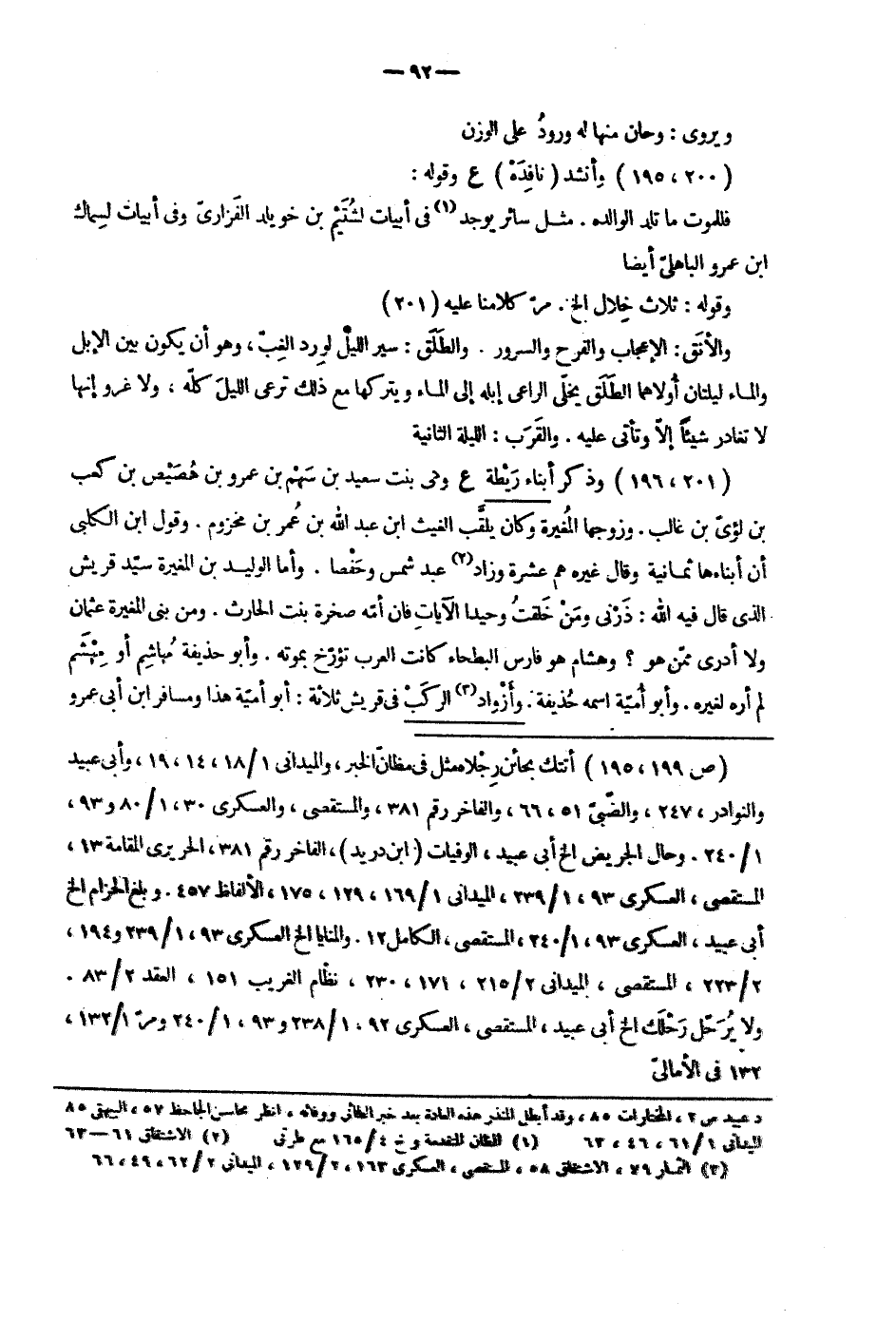 ويروى: وحان منها له ورود على الوزن 200، 195 وأنشد نافده ع وقوله: فللموت ما تلد الوالده. مثل سائر يوجد في أبيات لشتيم بن خويلد الفزارى وفي أبيات لسماك ابن عمرو الباهلي أيضا وقوله: ثلاث خلال الخ مر كلامنا عليه 201 والأنق: الإعجاب والفرح والسرور. والطلق: سير الليل لورد الغب، وهو أن يكون بين الإبل والماء ليلتان أولاهما الطلق يخلى الراعى إبله إلى الماء ويتركها مع ذلك ترعى الليل كله، ولا غرو إنها لا تغادر شيئاً إلا وتأتي عليه. والقرب: الليل الثانية 201، 196 وذكر أبناء ريطة ع وهي بنت سعيد بن سهم بن عمرو بن هصيص بن كعب بن لؤي بن غالب. وزوجها المغيرة وكان يلقب الغيث ابن عبد الله بن عمر بن مخزوم. وقول ابن الكلبي أن ابناءها ثمانية وقال غيره هم عشرة وزاد عبد شمس وحفصا. وأما الوليد بن المغيرة سيد قريش الذي قال فيه الله: ذرني ومن خلقت وحيدا الآيات فإن أمه صخرة بنت الحارث. ومن بنى المغيرة عثمان ولا أدرى ممن هو؟ وهشام هو فارس البطحاء كانت العرب تؤرخ بموته. وأبو حذيفة مهاشم أو مهشم لم أر لغيره. وأبو أمية اسمه حذيفة. وأزواد الركب في قريش ثلاثة: أبو أمية هذا ومسافر ابن أبي عمرو