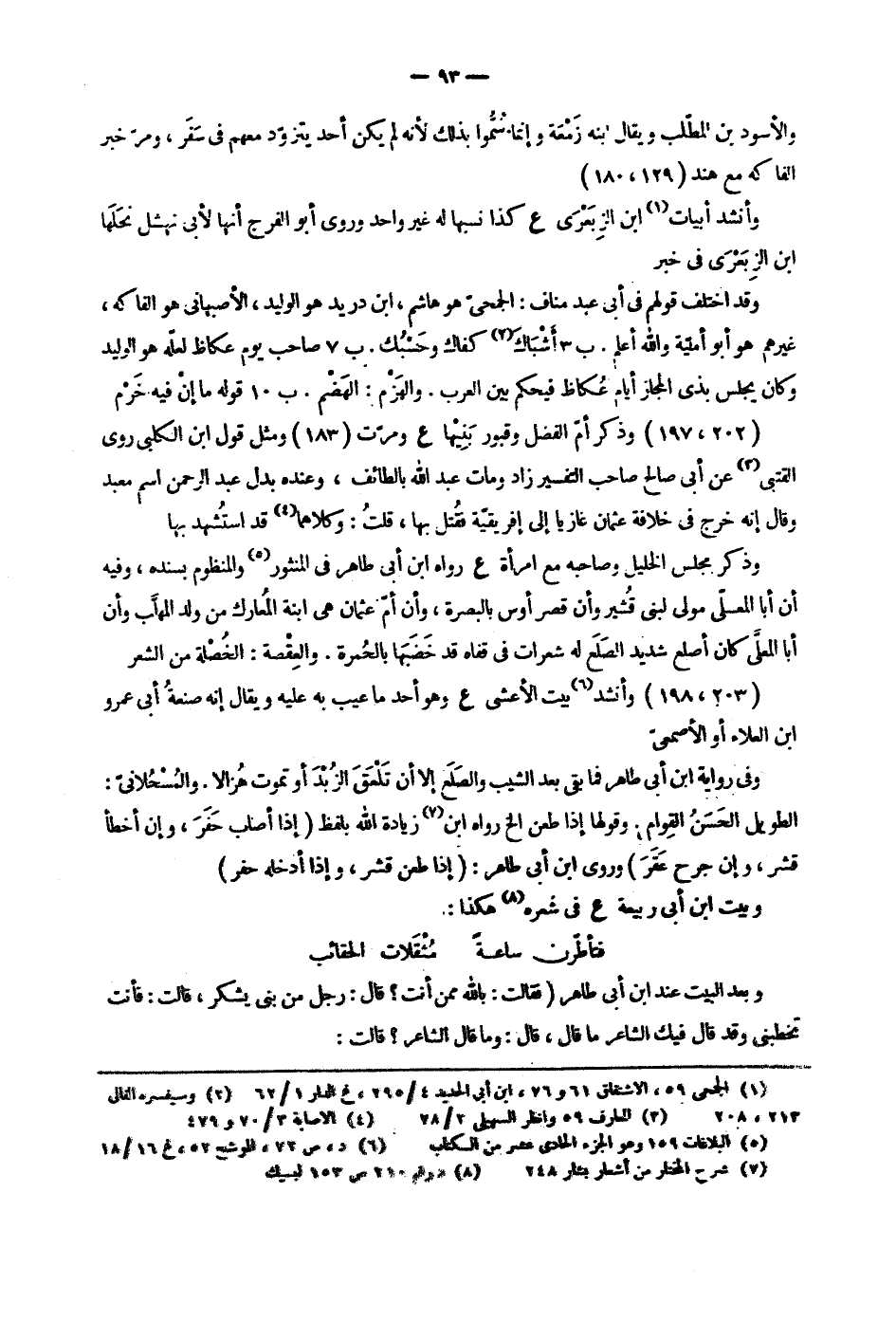 والأسود بن المطلب ويقال ابنه زمعة وإنما سموا بذلك لأنه لم يكن أحد يتزود معهم في سفر، ومر خبر الفاكه مع هند 129، 180 وأنشد أبيات ابن الزبعري ع كذا نسبها له غير واحد وروى أبو الفرج أنها لأبي نهشل نحلها ابن الزبعرى في خبر وقد اختلف قولهم في أبي عبد مناف: الجمحى هو هاشم، ابن دريد هو الوليد، الأصبهاني هو الفاكه، غيرهم هو أبو أمية والله أعلم ب3 أشباك كفاك وحسبك ب7 صاحب يوم عكاظ لعله هو الوليد وكان يجلس بذي المجاز أيام عكاظ فيحكم بين العرب والهزم الهضم ب قوله ما إن فيه خرم