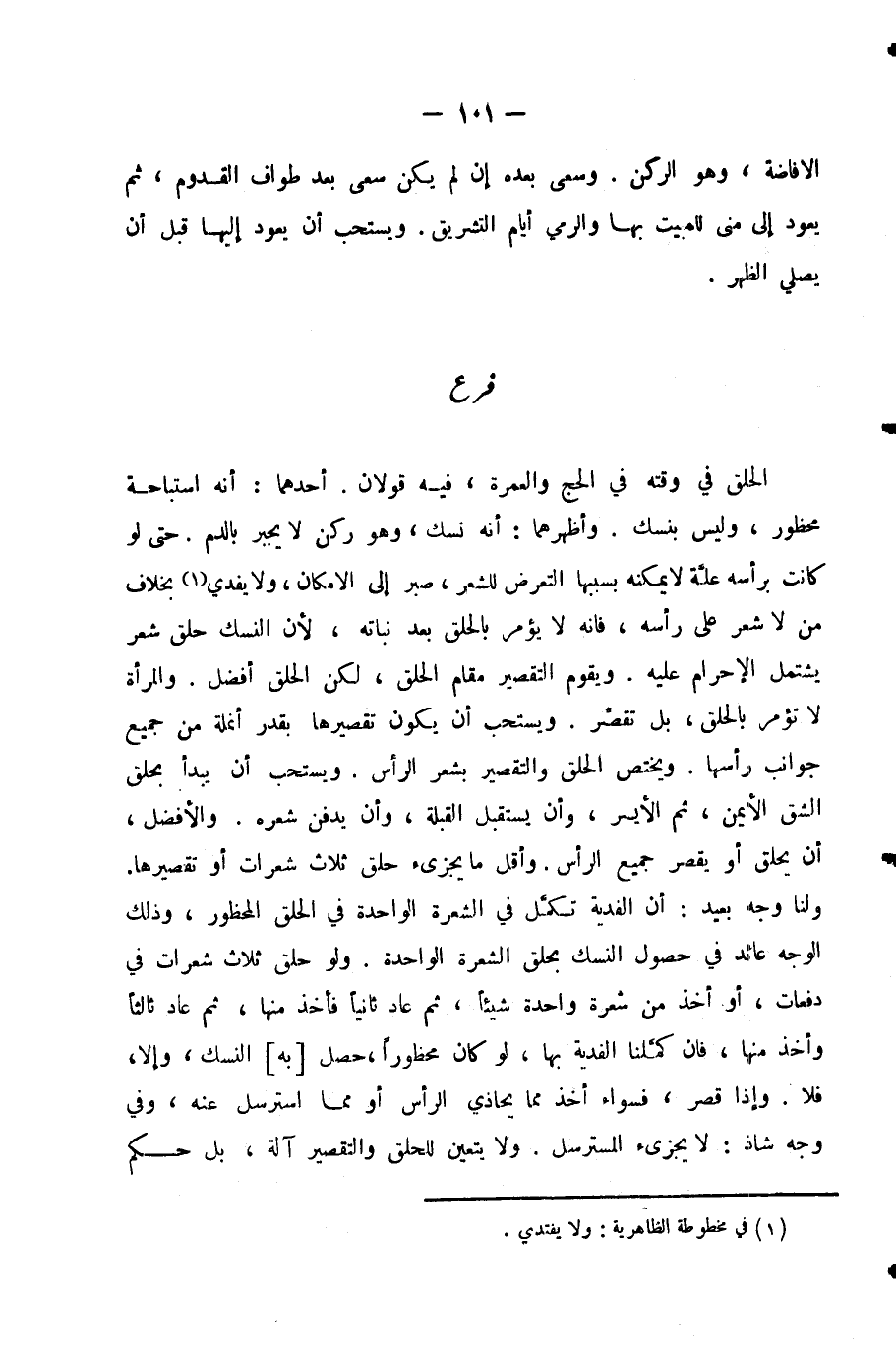 الْحَلْقُ فِي وَقْتِهِ فِي الْحَجِّ وَالْعُمْرَةِ، فِيهِ قَوْلَانِ. أَحَدُهُمَا: أَنَّهُ اسْتِبَاحَةُ مَحْظُورٍ، وَلَيْسَ بِنُسُكٍ. وَأَظْهَرُهُمَا: أَنَّهُ نُسُكٌ، وَهُوَ رُكْنٌ لَا يُجْبَرُ بِالدَّمِ. حَتَّى لَوْ كَانَتْ بِرَأْسِهِ عِلَّةٌ لَا يُمْكِنُهُ بِسَبَبِهَا التَّعَرُّضُ لِلشَّعْرِ صَبَرَ إِلَى الْإِمْكَانِ، وَلَا يَفْدِي بِخِلَافِ مَنْ لَا شَعْرَ عَلَى رَأْسِهِ، فَإِنَّهُ لَا يُؤْمَرُ بِالْحَلْقِ بَعْدَ نَبَاتِهِ؛ لِأَنَّ النُّسُكَ حَلْقُ شَعْرٍ يَشْتَمِلُ الْإِحْرَامُ عَلَيْهِ. وَيَقُومُ التَّقْصِيرُ مَقَامَ الْحَلْقِ، لَكِنَّ الْحَلْقَ أَفْضَلُ. وَالْمَرْأَةُ لَا تُؤْمَرُ بِالْحَلْقِ، بَلْ تُقَصِّرُ. وَيُسْتَحَبُّ أَنْ يَكُونَ تَقْصِيرُهَا بِقَدْرِ أُنْمُلَةٍ مِنْ جَمِيعِ جَوَانِبِ رَأْسِهَا. وَيَخْتَصُّ الْحَلْقُ وَالتَّقْصِيرُ بِشَعْرِ الرَّأْسِ. وَيُسْتَحَبُّ أَنْ يَبْدَأَ بِحَلْقِ الشِّقِّ الْأَيْمَنِ، ثُمَّ الْأَيْسَرِ، وَأَنْ يَسْتَقْبِلَ الْقِبْلَةَ، وَأَنْ يَدْفِنَ شَعْرَهُ. وَالْأَفْضَلُ، أَنْ يَحْلِقَ أَوْ يُقَصِّرَ جَمِيعَ الرَّأْسِ. وَأَقَلُّ مَا يُجْزِئُ حَلْقُ ثَلَاثِ شَعَرَاتٍ أَوْ تَقْصِيرُهَا. وَلَنَا وَجْهٌ بَعِيدٌ: أَنَّ الْفِدْيَةَ تَكْمُلُ فِي الشَّعْرَةِ الْوَاحِدَةِ فِي الْحَلْقِ الْمَحْظُورِ، وَذَلِكَ الْوَجْهُ عَائِدٌ فِي حُصُولِ النُّسُكِ بِحَلْقِ الشَّعْرَةِ الْوَاحِدَةِ. وَلَوْ حَلَقَ ثَلَاثَ شَعَرَاتٍ فِي دُفْعَاتٍ، أَوْ أَخَذَ مِنْ شَعْرَةٍ وَاحِدَةٍ شَيْئًا، ثُمَّ عَادَ ثَانِيًا فَأَخَذَ مِنْهَا، ثُمَّ عَادَ ثَالِثًا وَأَخَذَ مِنْهَا، فَإِنْ كَمَّلْنَا الْفِدْيَةَ بِهَا، لَوْ كَانَ مَحْظُورًا حَصَلَ [بِهِ] النُّسُكُ، وَإِلَّا فَلَا. وَإِذَا قَصَّرَ، فَسَوَاءٌ أَخَذَ مِمَّا يُحَاذِي الرَّأْسَ أَوْ مِمَّا اسْتَرْسَلَ عَنْهُ، وَفِي وَجْهٍ شَاذٍّ: لَا يُجْزِئُ الْمُسْتَرْسِلُ. وَلَا يَتَعَيَّنُ لِلْحَلْقِ وَالتَّقْصِيرِ آلَةٌ، بَلْ حُكْمُ