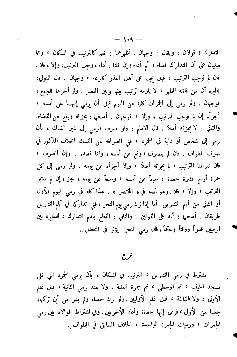 وَالثَّانِي: لَا يُجْزِئُهُ أَصْلًا. قَالَ الْإِمَامُ: وَلَوْ صَرَفَ الرَّمْيَ إِلَى غَيْرِ النُّسُكِ، بِأَنْ رَمَى إِلَى شَخْصٍ أَوْ دَابَّةٍ فِي الْجَمْرَةِ، فَفِي انْصِرَافِهِ عَنِ النُّسُكِ الْخِلَافُ الْمَذْكُورُ فِي صَرْفِ الطَّوَافِ. فَإِنْ لَمْ يَنْصَرِفْ وَقَعَ عَنْ أَمْسِهِ، وَلَغَا قَصْدُهُ. وَإِنِ انْصَرَفَ، فَإِنْ شَرَطْنَا التَّرْتِيبَ، لَمْ يُجْزِئْهُ أَصْلًا، وَإِلَّا أَجْزَأَهُ عَنْ يَوْمِهِ. وَلَوْ رَمَى إِلَى كُلِّ جَمْرَةٍ أَرْبَعَ عَشْرَةَ حَصَاةً، سَبْعًا عَنْ أَمْسِهِ، وَسَبْعًا عَنْ يَوْمِهِ، جَازَ إِنْ لَمْ نَعْتَبِرِ التَّرْتِيبَ، وَإِلَّا فَلَا. وَهُوَ نَصُّهُ فِي الْمُخْتَصَرِ. هَذَا كُلُّهُ فِي رَمْيِ الْيَوْمِ الْأَوَّلِ أَوِ الثَّانِي مِنْ أَيَّامِ التَّشْرِيقِ. أَمَّا إِذَا تَرَكَ رَمْيَ يَوْمِ النَّحْرِ، فَفِي تَدَارُكِهِ فِي أَيَّامِ التَّشْرِيقِ طَرِيقَانِ. أَصَحُّهُمَا: أَنَّهُ عَلَى الْقَوْلَيْنِ. وَالثَّانِي: الْقَطْعُ بِعَدَمِ التَّدَارُكِ لِلْمُغَايَرَةِ بَيْنَ الرَّمْيَيْنِ قَدْرًا وَوَقْتًا وَحُكْمًا، فَإِنَّ رَمْيَ النَّحْرِ يُؤَثِّرُ فِي التَّحَلُّلِ.