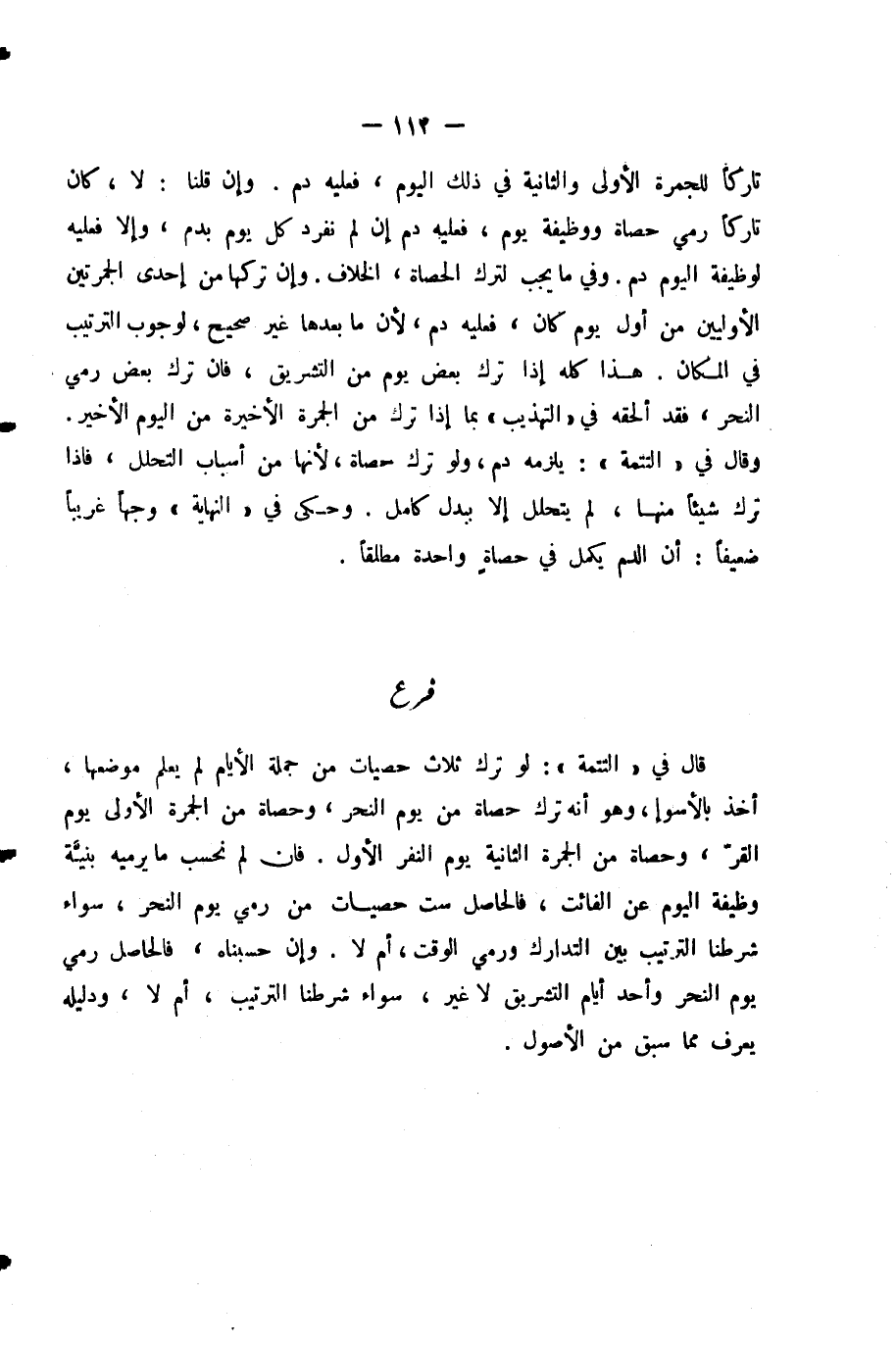 تَارِكًا لِلْجَمْرَةِ الْأُولَى وَالثَّانِيَةِ فِي ذَلِكَ الْيَوْمِ، فَعَلَيْهِ دَمٌ. وَإِنْ قُلْنَا: لَا كَانَ تَارِكًا رَمْيَ حَصَاةٍ وَوَظِيفَةَ يَوْمٍ، فَعَلَيْهِ دَمٌ إِنْ لَمْ نُفْرِدْ كُلَّ يَوْمٍ بِدَمٍ، وَإِلَّا فَعَلَيْهِ لِوَظِيفَةِ الْيَوْمِ دَمٌ. وَفِي مَا يَجِبُ لِتَرْكِ الْحَصَاةِ الْخِلَافُ. وَإِنْ تَرَكَهَا مِنْ إِحْدَى الْجَمْرَتَيْنِ الْأُولَيَيْنِ مِنْ أَوَّلِ يَوْمٍ كَانَ فَعَلَيْهِ دَمٌ، لِأَنَّ مَا بَعْدَهَا غَيْرُ صَحِيحٍ، لِوُجُوبِ التَّرْتِيبِ فِي الْمَكَانِ. هَذَا كُلُّهُ إِذَا تَرَكَ بَعْضَ يَوْمٍ مِنَ التَّشْرِيقِ، فَإِنْ تَرَكَ بَعْضَ رَمْيِ النَّحْرِ، فَقَدْ أَلْحَقَهُ فِي «التَّهْذِيبِ» بِمَا إِذَا تَرَكَ مِنَ الْجَمْرَةِ الْأَخِيرَةِ مِنَ الْيَوْمِ الْأَخِيرِ.